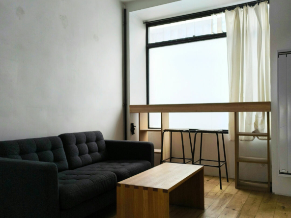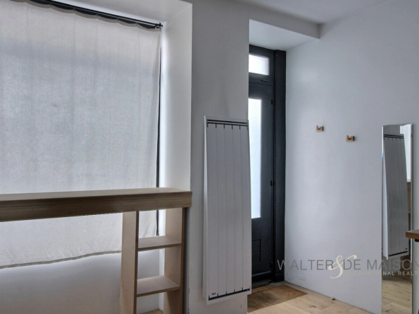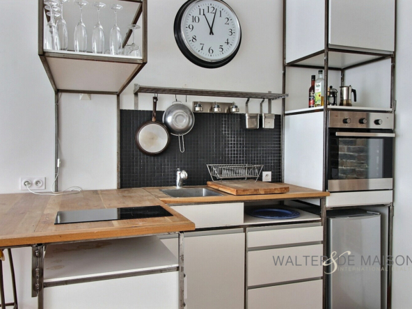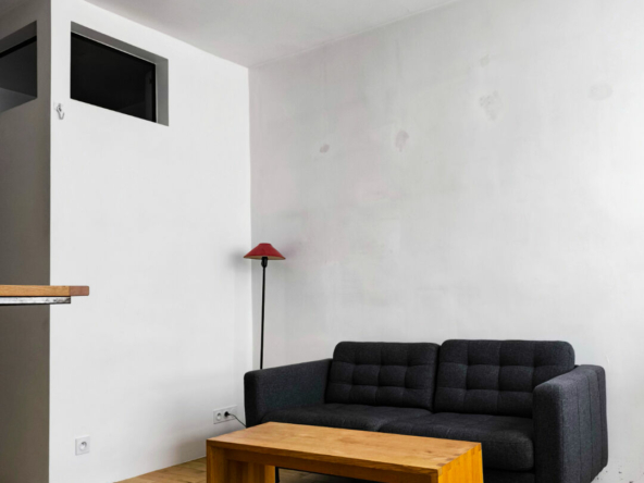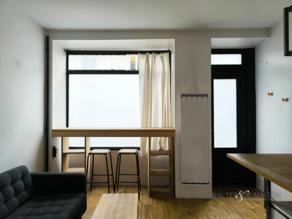 Il se compose, côté rue dans une ancienne boutique : d’une pièce de vie avec bloc cuisine au design aménagé sur mesure et d’une salle d’eau avec WC.