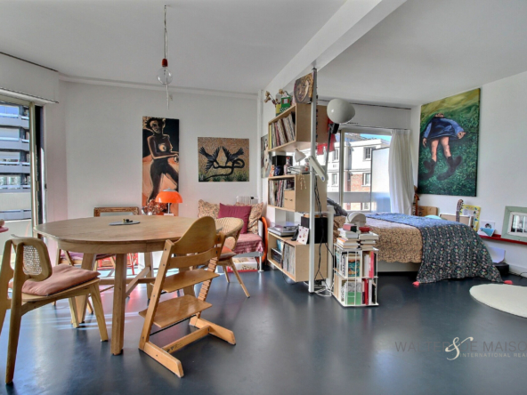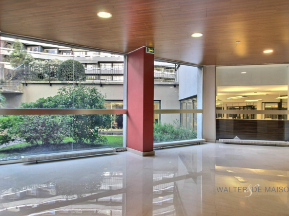 Au calme, grand studio contemporain de 49m2 avec grandes baies vitrées offrant une belle luminosité (sud/sud-ouest) et donnant accès au BALCON FILANT (10 m2) en surplomb du jardin paysagé (jardin dont pourront profiter les copropriétaires pour des déjeuners ou repos sur l’herbe par exemple)