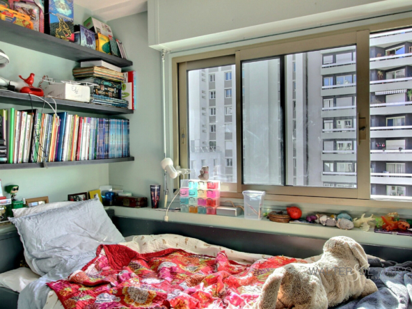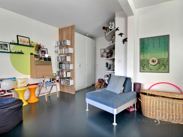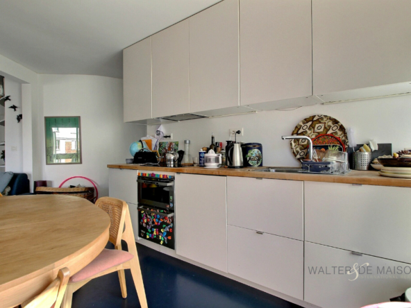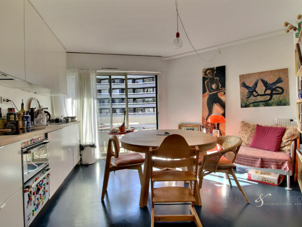 L’appartement bénéficie d’une grande et chaleureuse pièce de vie dotée d’une cuisine très fonctionnelle, ouverte et dinatoire, d’un espace nuit, d’une petite pièce fermée de 7,3 m2 (chambre d’enfant ou bureau), d’une salle de bains avec WC.
