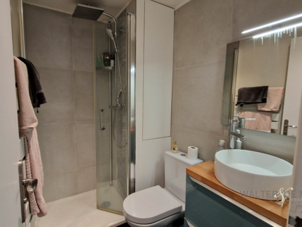 Pièce principale avec 3 fenêtres double vitrage donnant sur une jolie cour végétalisée, cuisine ouverte bien équipée, coin chambre avec de nombreux placards et salle de douche avec toilettes.