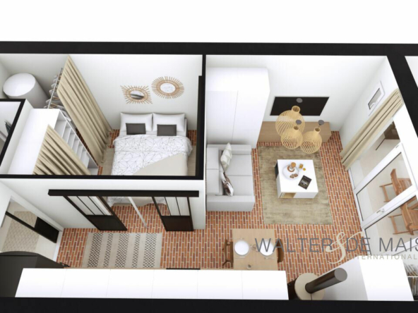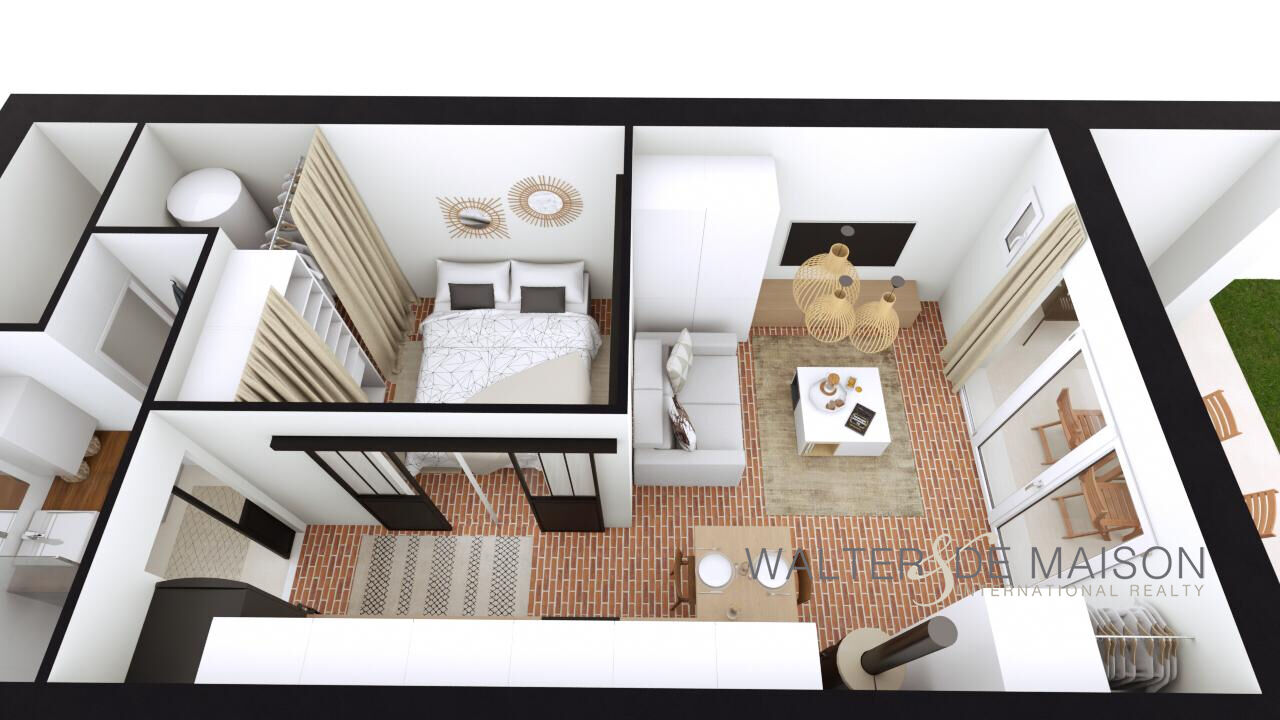 Il se compose d’un séjour avec cuisine américaine équipée, d’une chambre avec rangements, ainsi que d’une salle d’eau avec douche à l’italienne et WC.