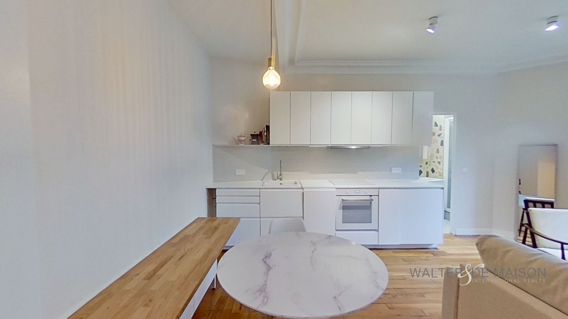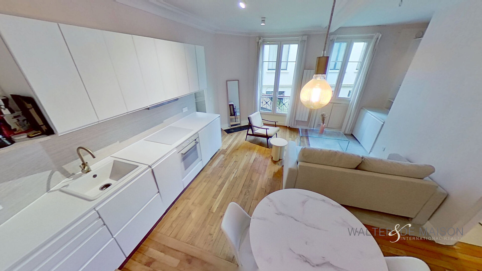 Séjour lumineux avec cuisine ouverte aménagée et entièrement équipée :
