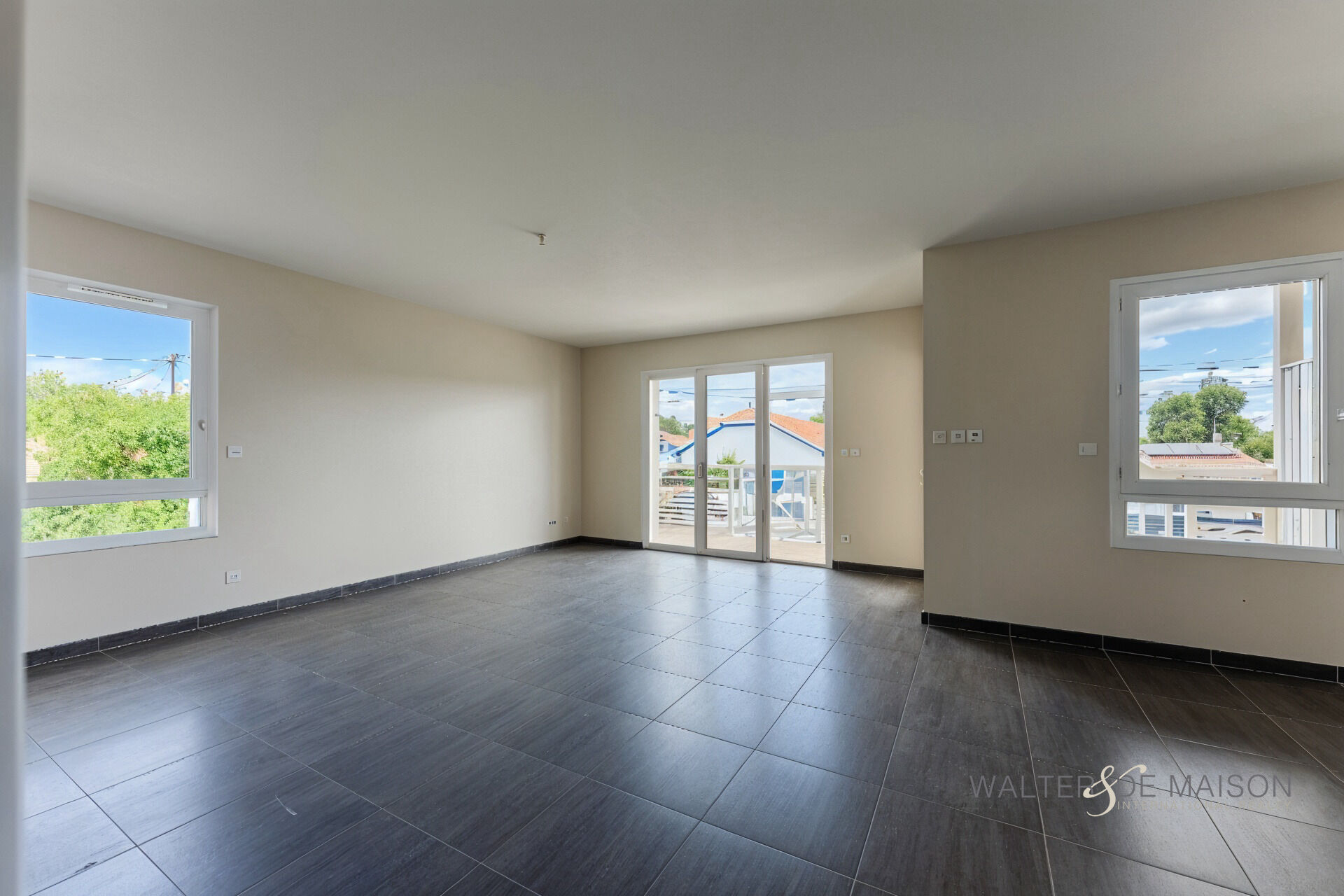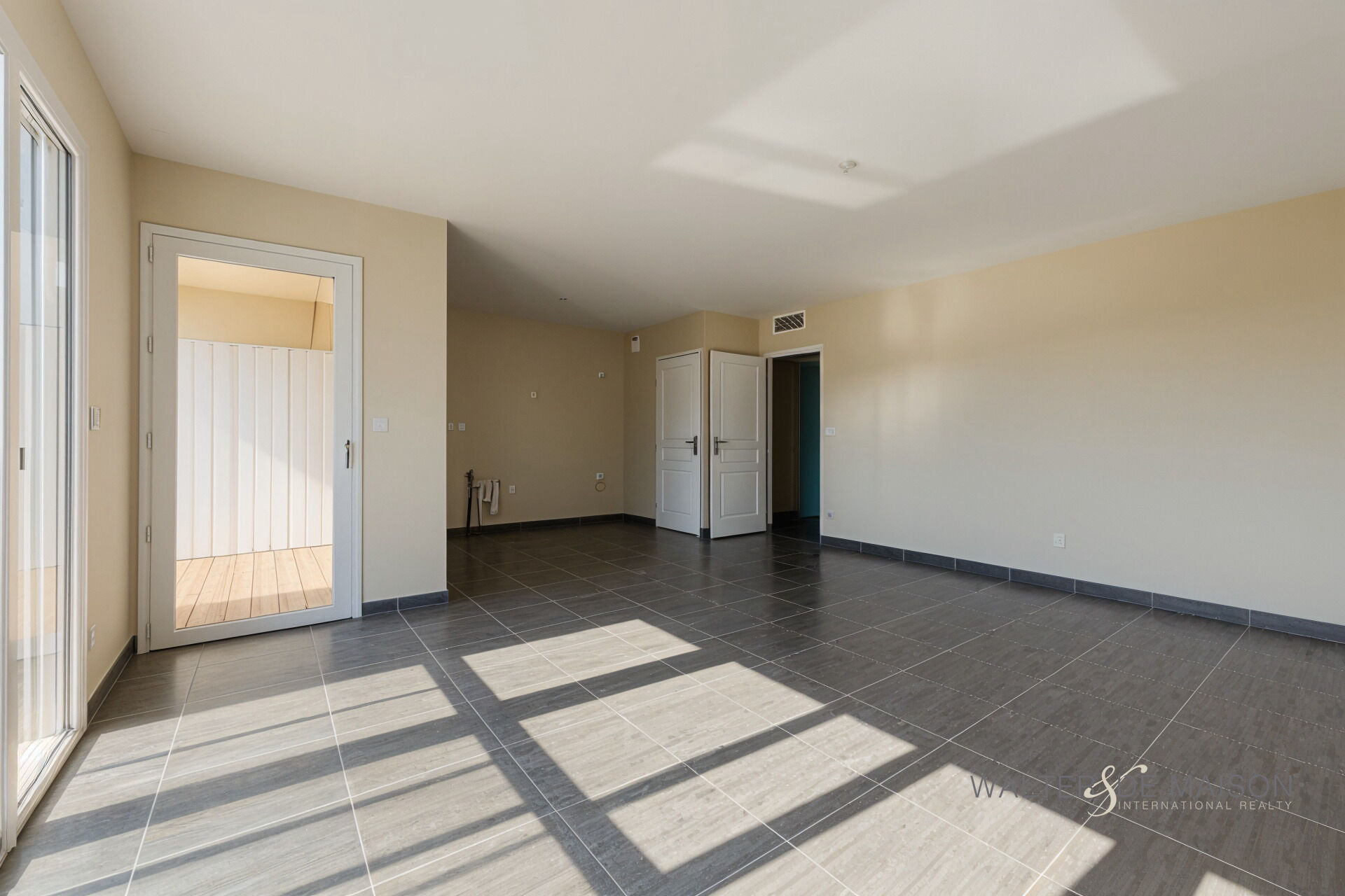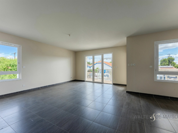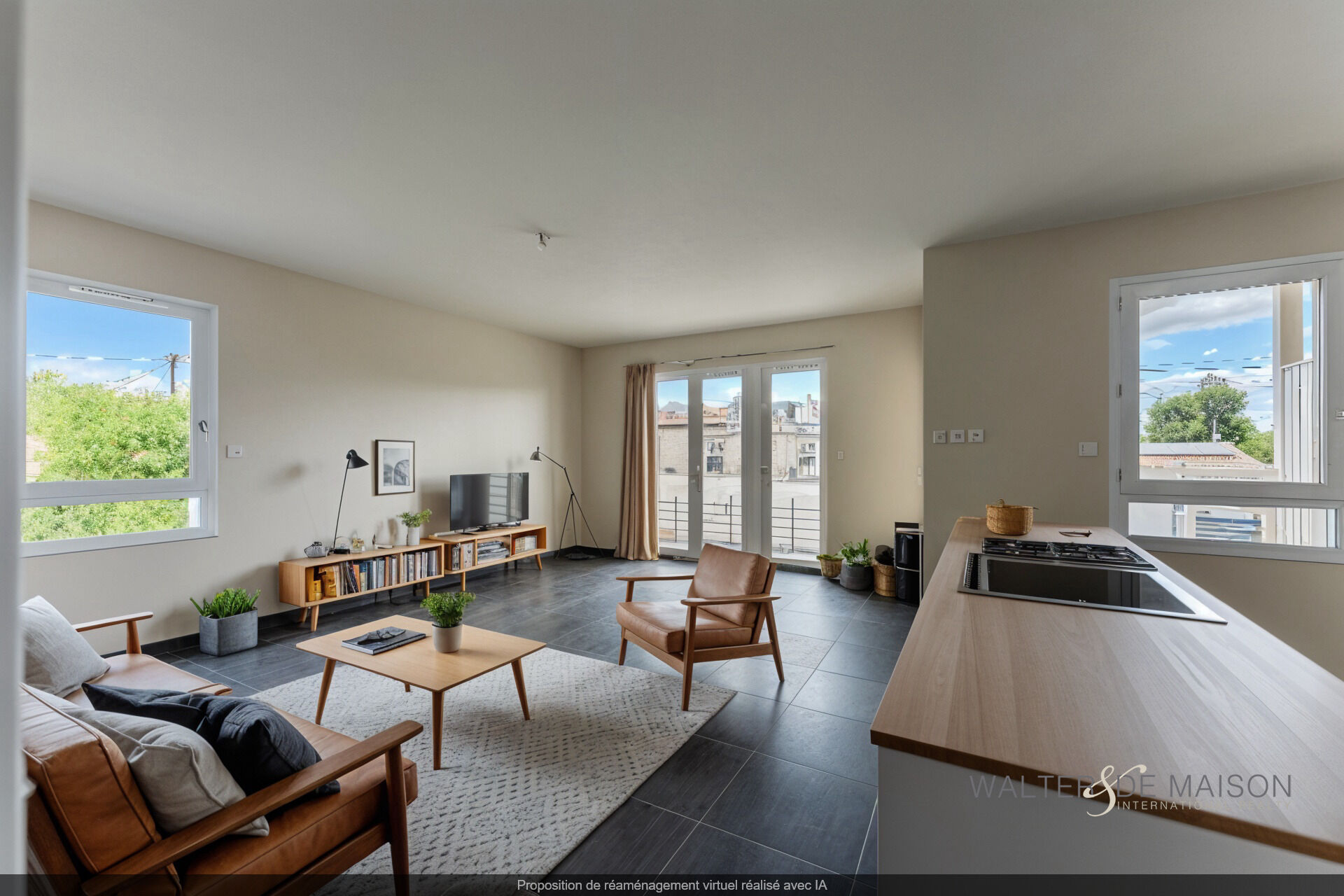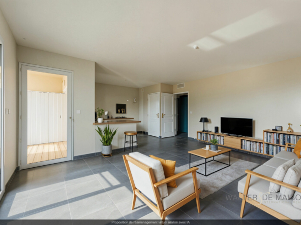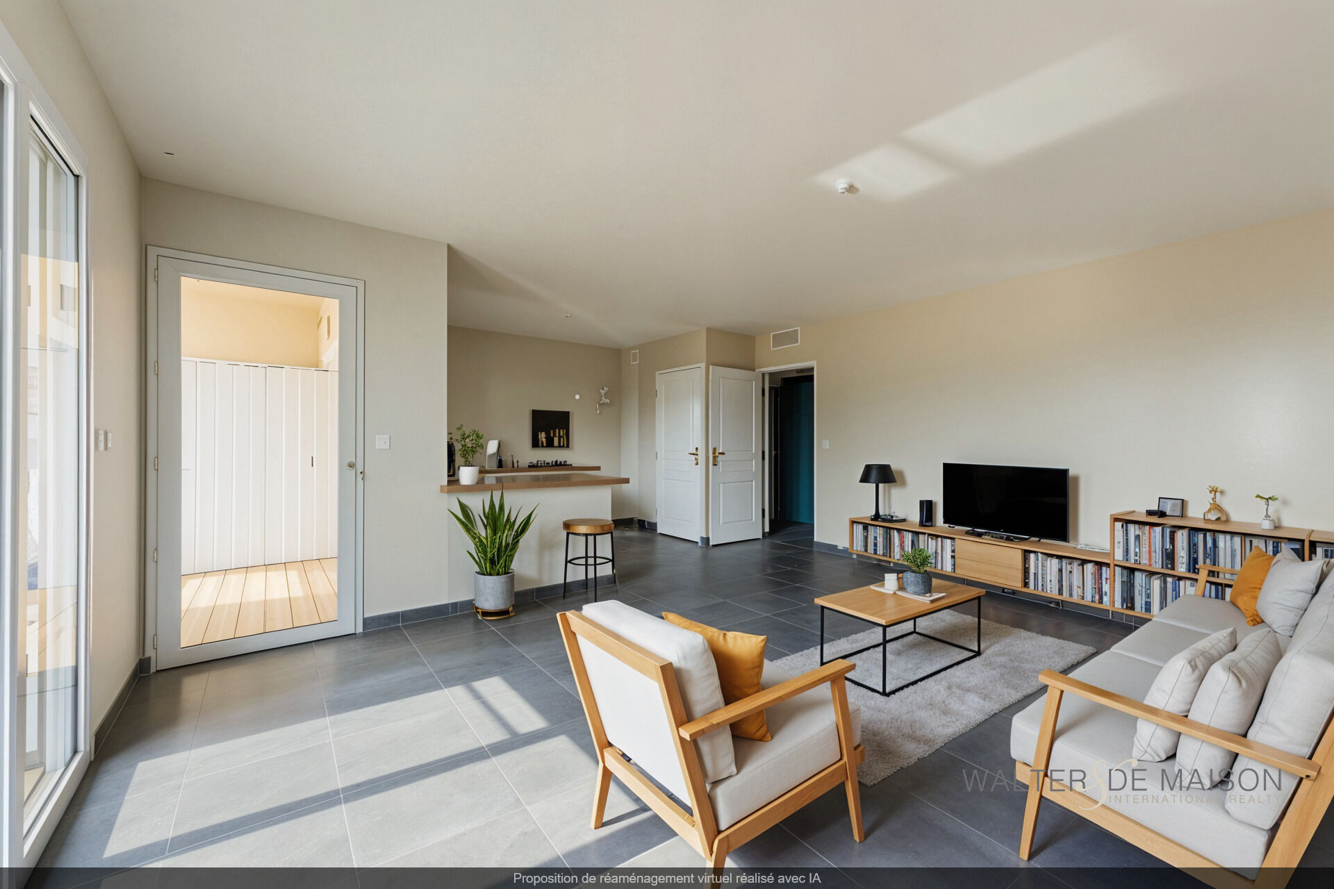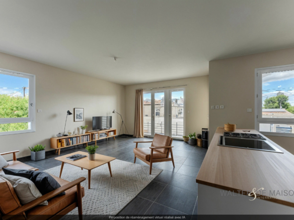 Un séjour lumineux avec coin cuisine, ouvert sur une terrasse