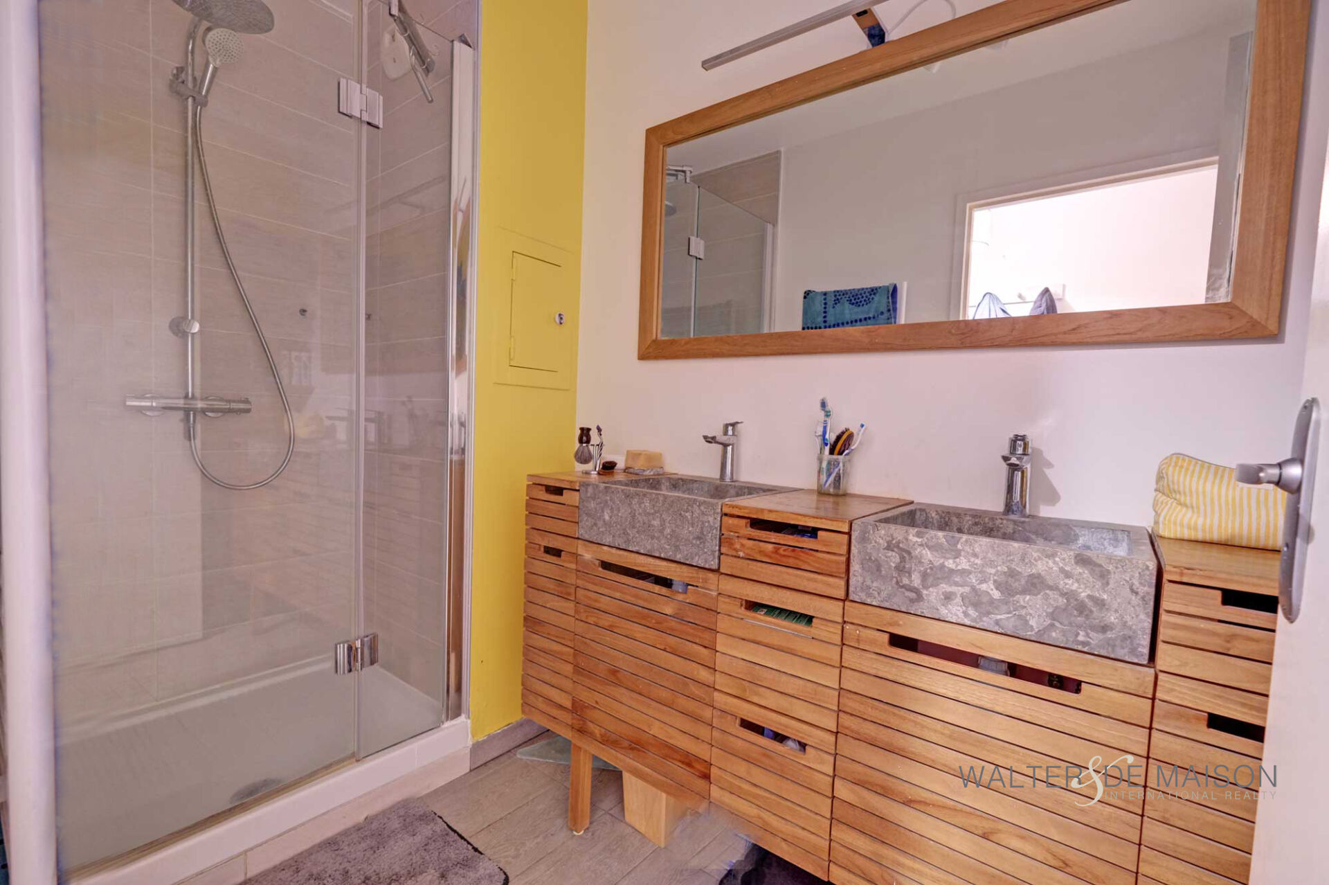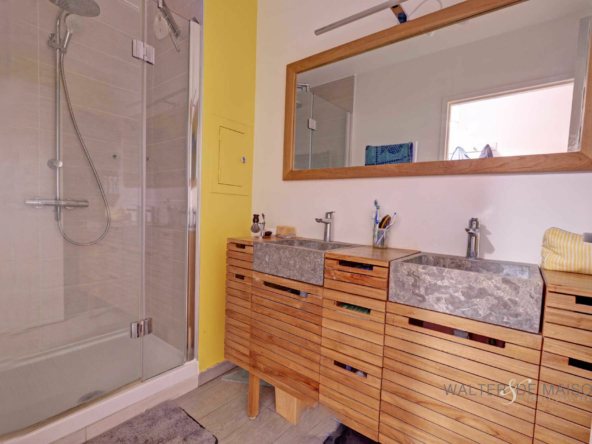 Il offre au premier niveau 2 chambres bien agencées avec espaces de rangement aménagés (9,34 m2 et 9,04 m2 Carrez), une salle d’eau moderne avec lavabo double vasque, et un WC indépendant. Un espace de rangement de 2m2 sous l’escalier fait office de cellier.