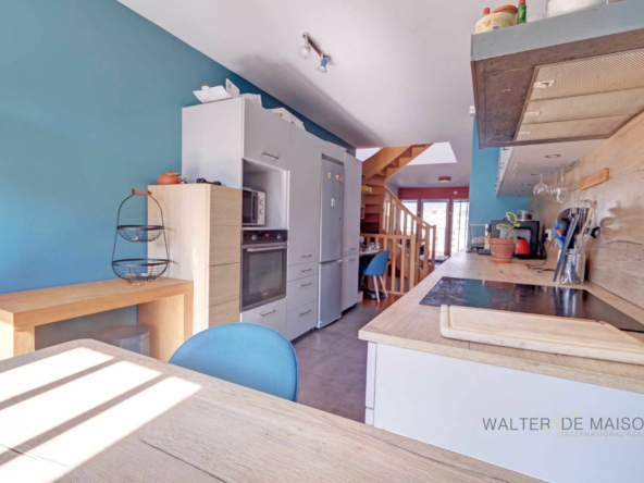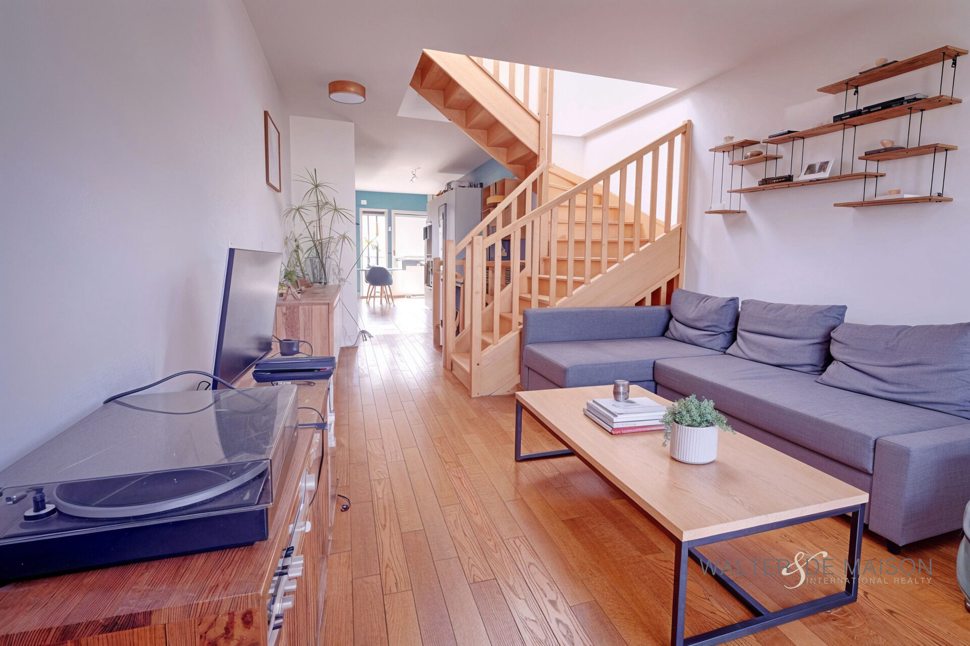Au deuxième niveau vous profiterez d’un pièce de vie de 32m2 composée d’un espace salon avec parquet en chêne massif, d’une cuisine ouverte moderne, aménagée et équipée, et d’un accès au toit-terrasse.