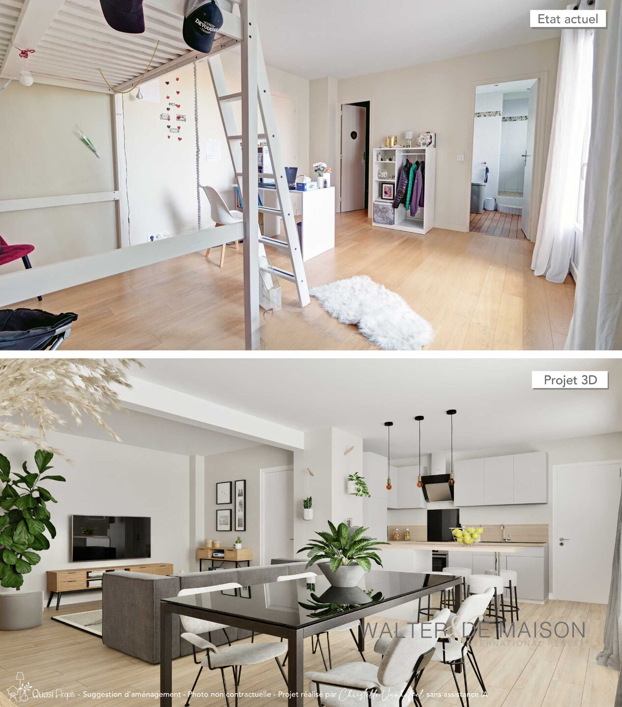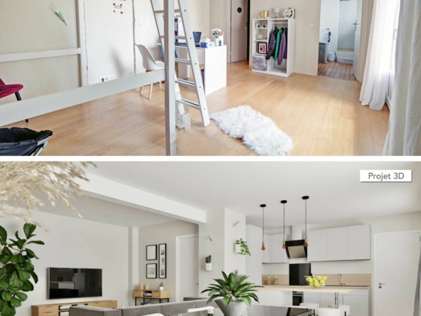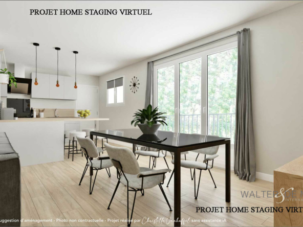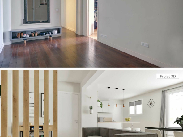Décloisonnement possible de l’entrée pour créer un vaste espace salon salle à manger de 41,38 m2 carrez (voir photos de Home Staging virtuel).