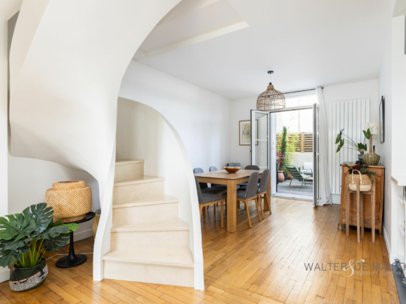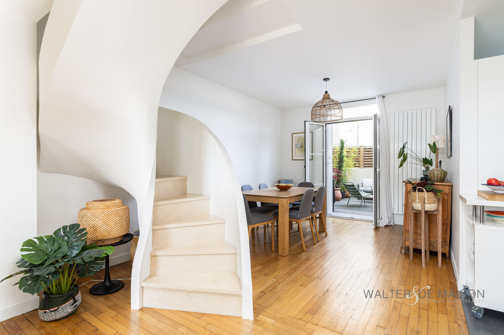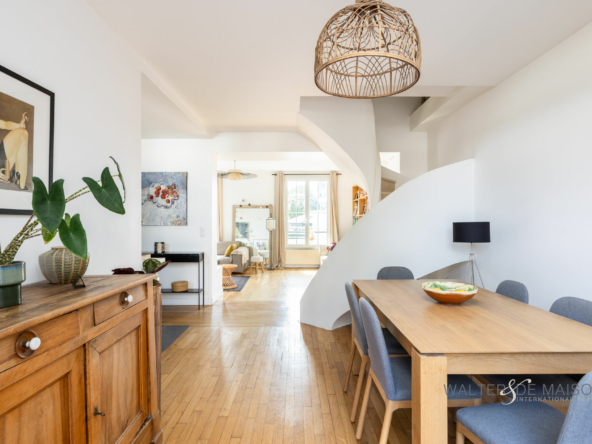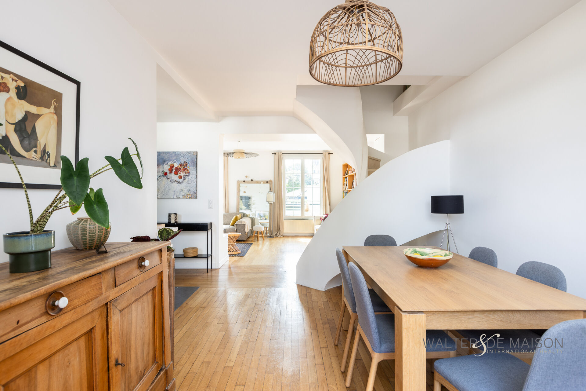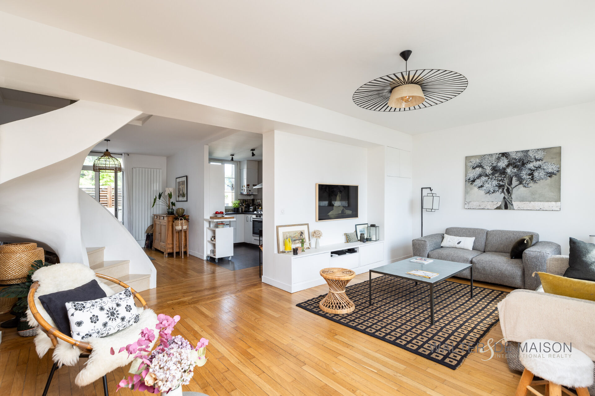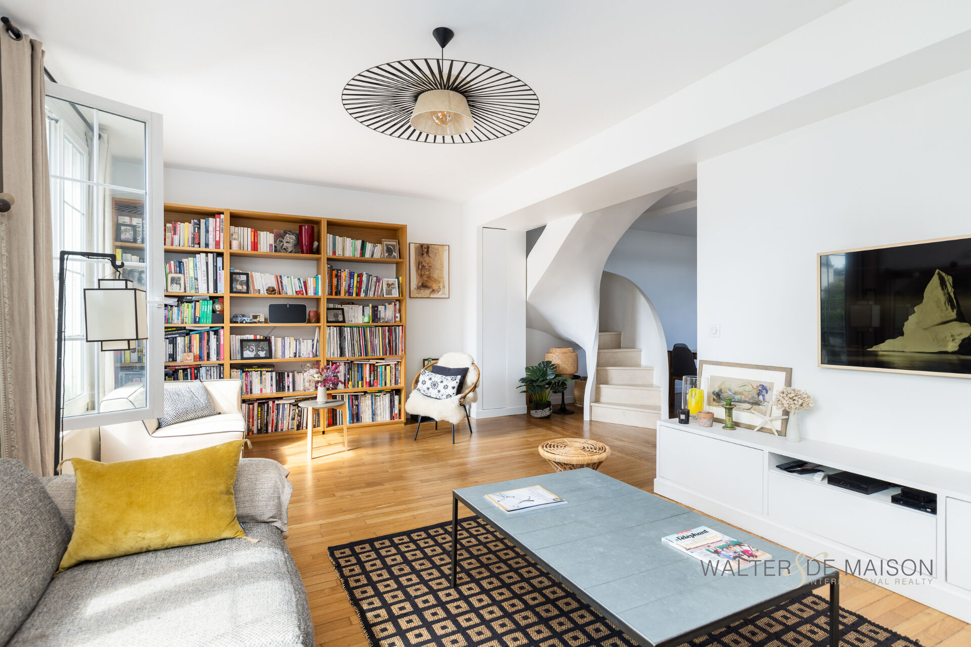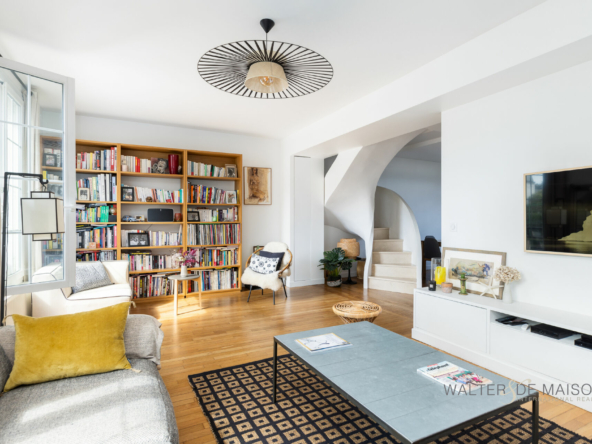 RARE A LA VENTE !! COUP DE COEUR ! En plein centre de Meudon Bellevue, à proximité immédiate des transports, commerces et écoles, très agréable appartement familial et de réception de 100 m2 doté d’une terrasse privative de 16m2, au sein d’un bel immeuble ancien des années 30 bien entretenu. Traversant, lumineux et ensoleillé, cet appartement duplex se compose au premier niveau d’une entrée avec rangements intégrés, une cuisine américaine ouverte sur une salle à manger de plain-pied avec la terrasse arborée, un vaste double-séjour sur rue et une salle d’eau avec toilettes. Un superbe escalier en pierre réalisé sur mesure donne accès à l’étage qui offre un palier, 3 belles chambres de plus de 12 m2 chacune et une salle de douche avec toilettes. Deux caves complètent ce bien.