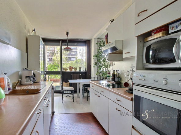 Très au calme, Il offre une entrée, une belle pièce de vie donnant sur jardin avec un grand balcon filant, quatre chambres, une cuisine aménagée avec coin repas, une salle de bains avec wc, une salle de douche, des wc séparés, placards. Cave et emplacement de parking en sous-sol, gardien, fibre optique.