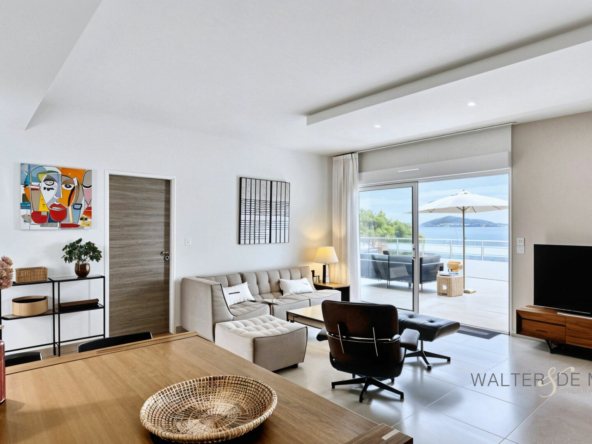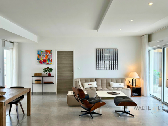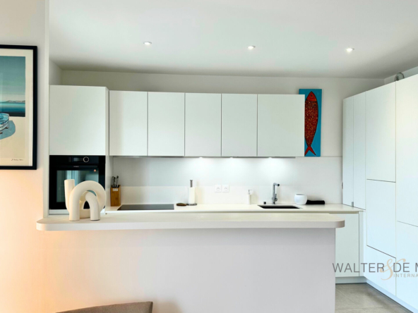 La pièce de vie, spacieuse et lumineuse, conjugue harmonieusement cuisine contemporaine minimaliste et vaste séjour, sublimé par l’effet in et out avec la terrasse, véritable prolongement naturel de l’espace intérieur.