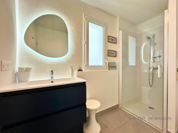 L’espace nuit se compose d’une suite parentale avec accès direct à la terrasse, garantissant intimité et confort, ainsi que de deux chambres supplémentaires situées à l’opposé, préservant la tranquillité de chacun. Une seconde terrasse orientée nord complète l’ensemble, offrant la possibilité d’être transformée en quatrième chambre.