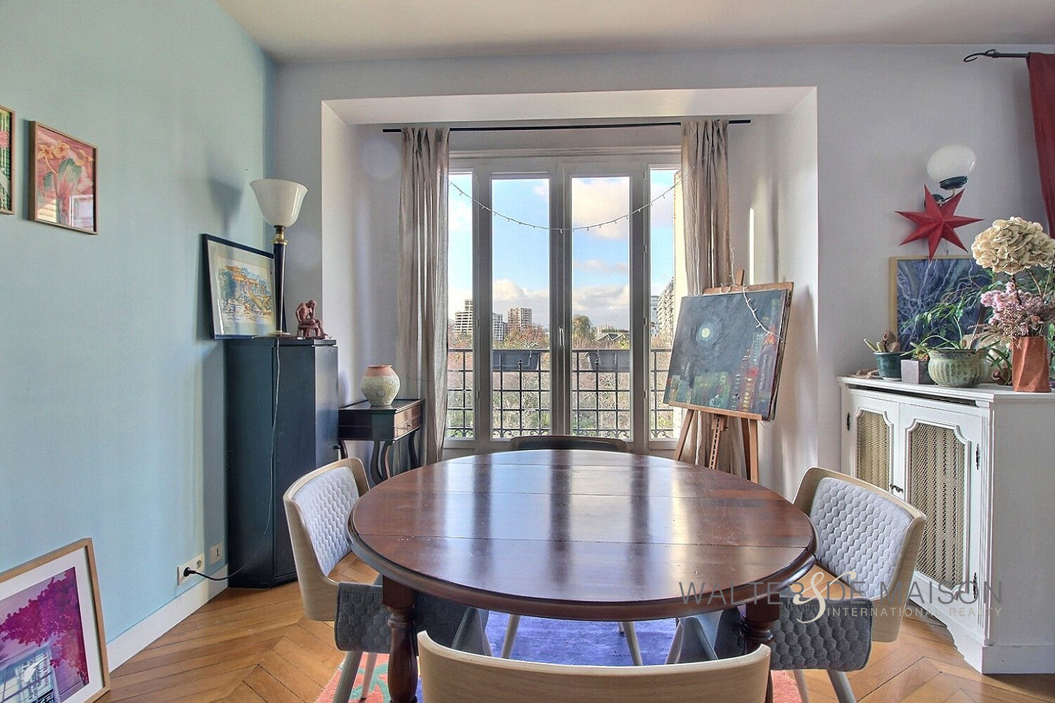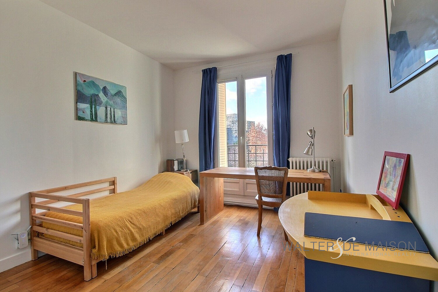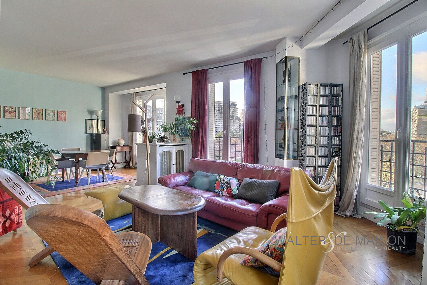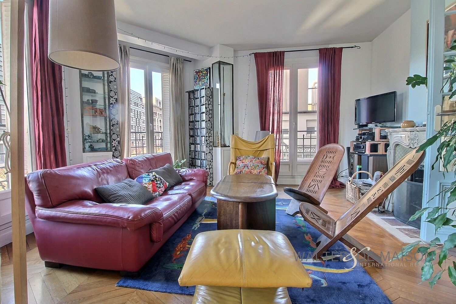 L’appartement offre cinq pièces principales, dont trois chambres, l’une avec salle d’eau et toilettes attenantes. Le double séjour en angle, agrémenté d’une cheminée, offre une vue dégagée sur un parc baignant l’espace de lumière naturelle.