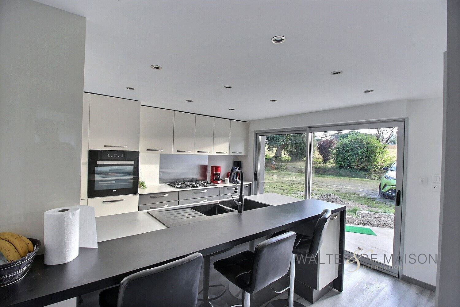 La maison est raccordée au réseau électrique et alimentée aussi avec des panneaux voltaïques avec batteries de 9 kilowatts