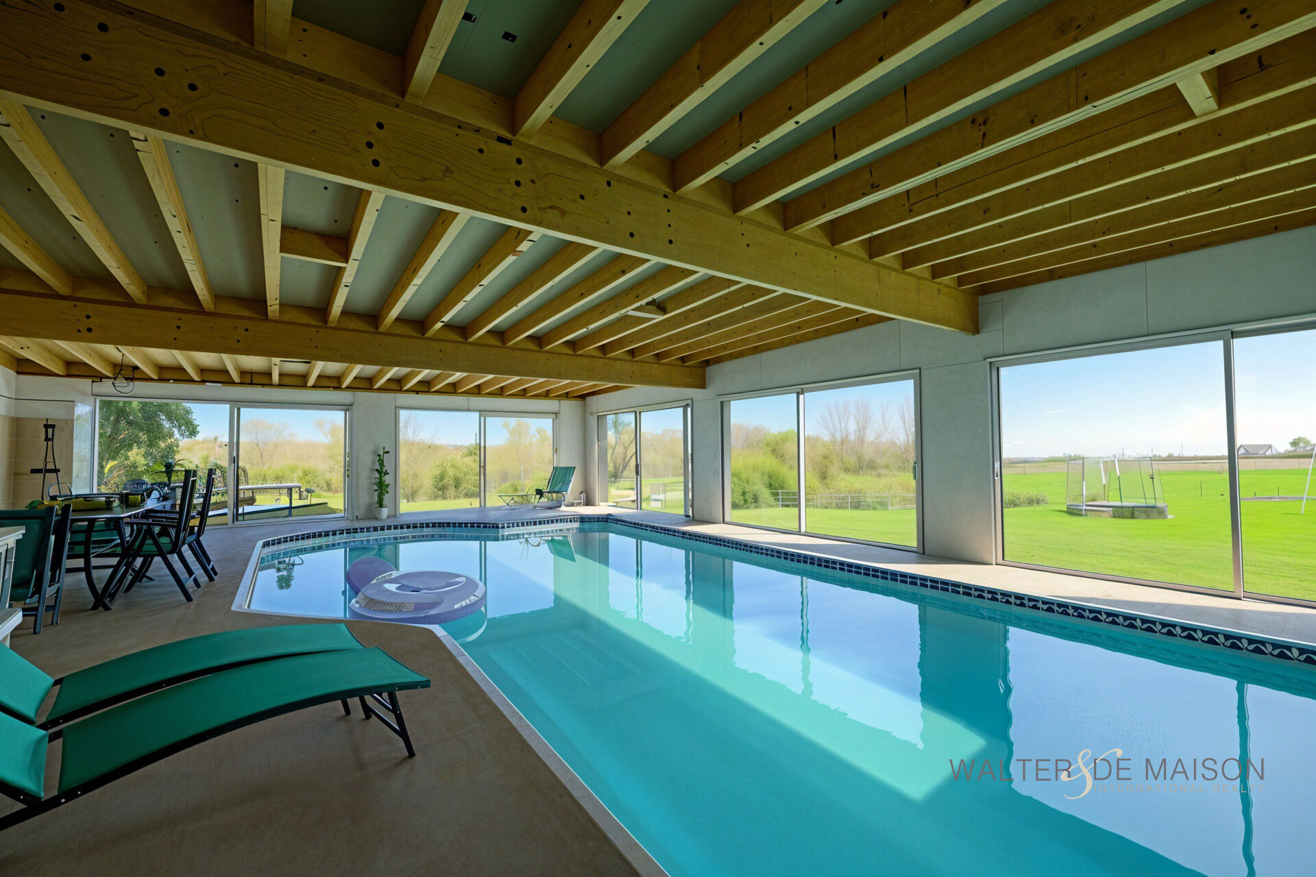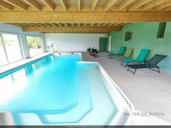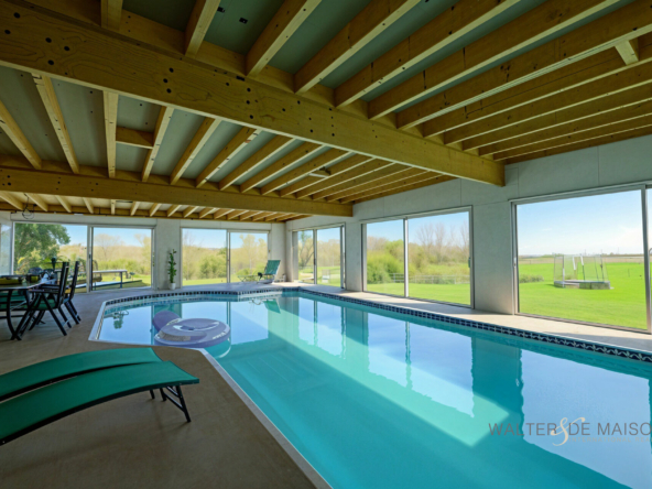 On y trouve également un espace piscine couvert de 125m² avec un bassin de 10×6 chauffé par une pompe à chaleur, avec accès à une belle terrasse en bois.