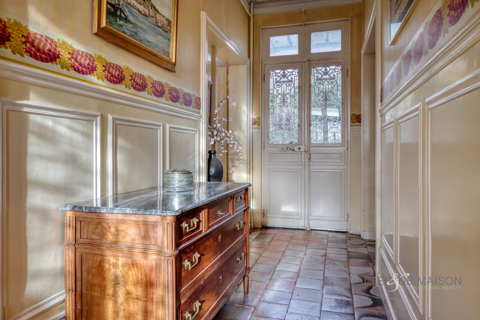 L’accès principal se fait par un perron, aujourd’hui à l’arrière de la demeure, chapeautée d’une marquise. Derrière la porte d’entrée en bois, vitrée et protégée par de fines ferronneries, un vaste vestibule, au sol couvert de carreaux anciens en terre cuite distribue les espaces du rez-de-chaussée. A gauche se présente un salon de réception lumineux aux amples proportions. Il a conservé ses éléments de décor anciens : parquets en point de Hongrie, soubassements moulurés, cheminées en marbre, trumeau et grandes fenêtres qui donnent sur le jardin. A droite, la salle à manger et un petit salon communiquent avec une vaste cuisine, laquelle s’ouvre sur une petite terrasse (et une arrière-cuisine). Celle-ci procure un prolongement vers l’extérieur qui pourrait être optimisé. Un dégagement et l’escalier principal s’ajoutent au niveau.