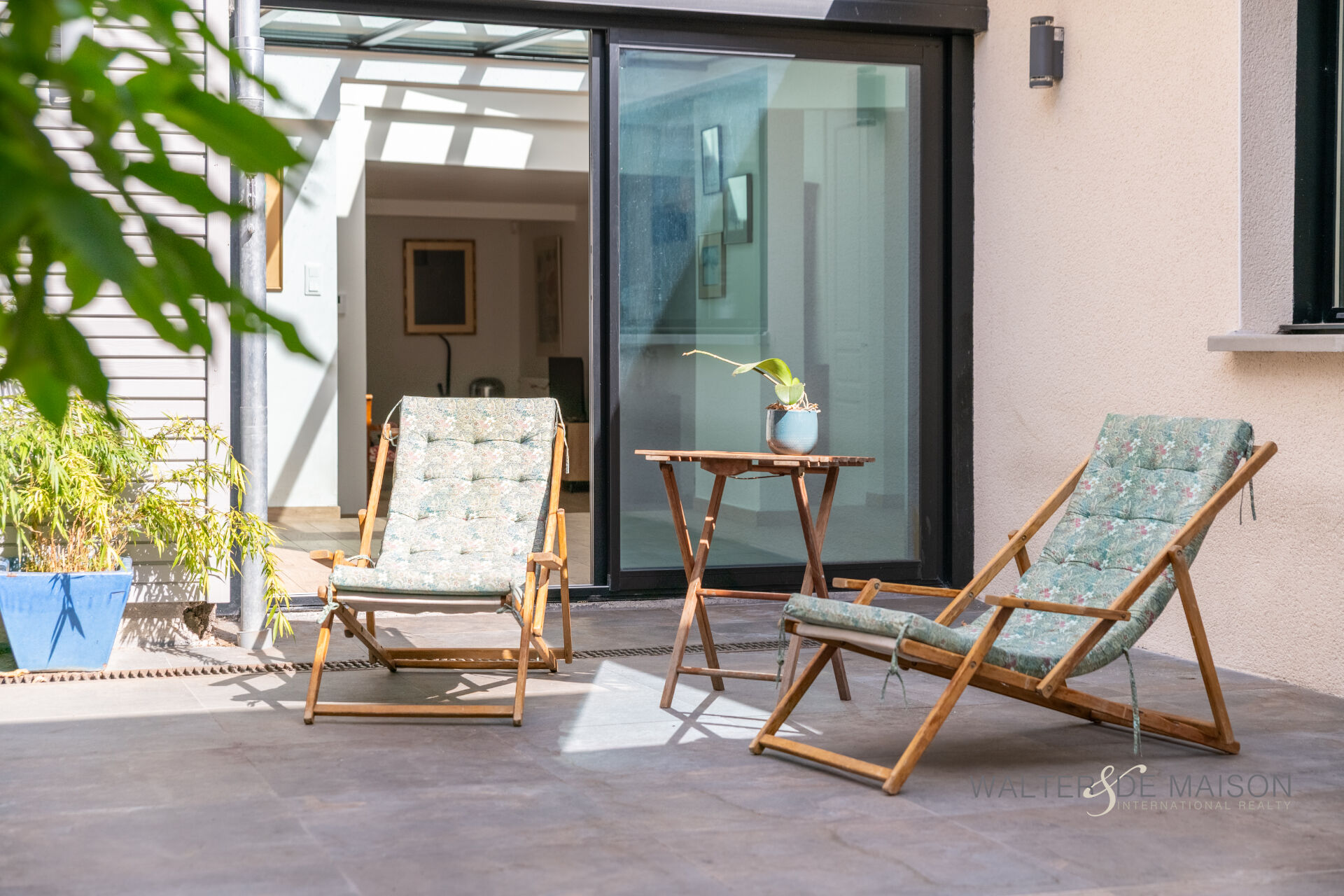 Une pièce de vie spacieuse et lumineuse avec cheminée, donnant sur un magnifique patio de 48 m², véritable havre de paix.