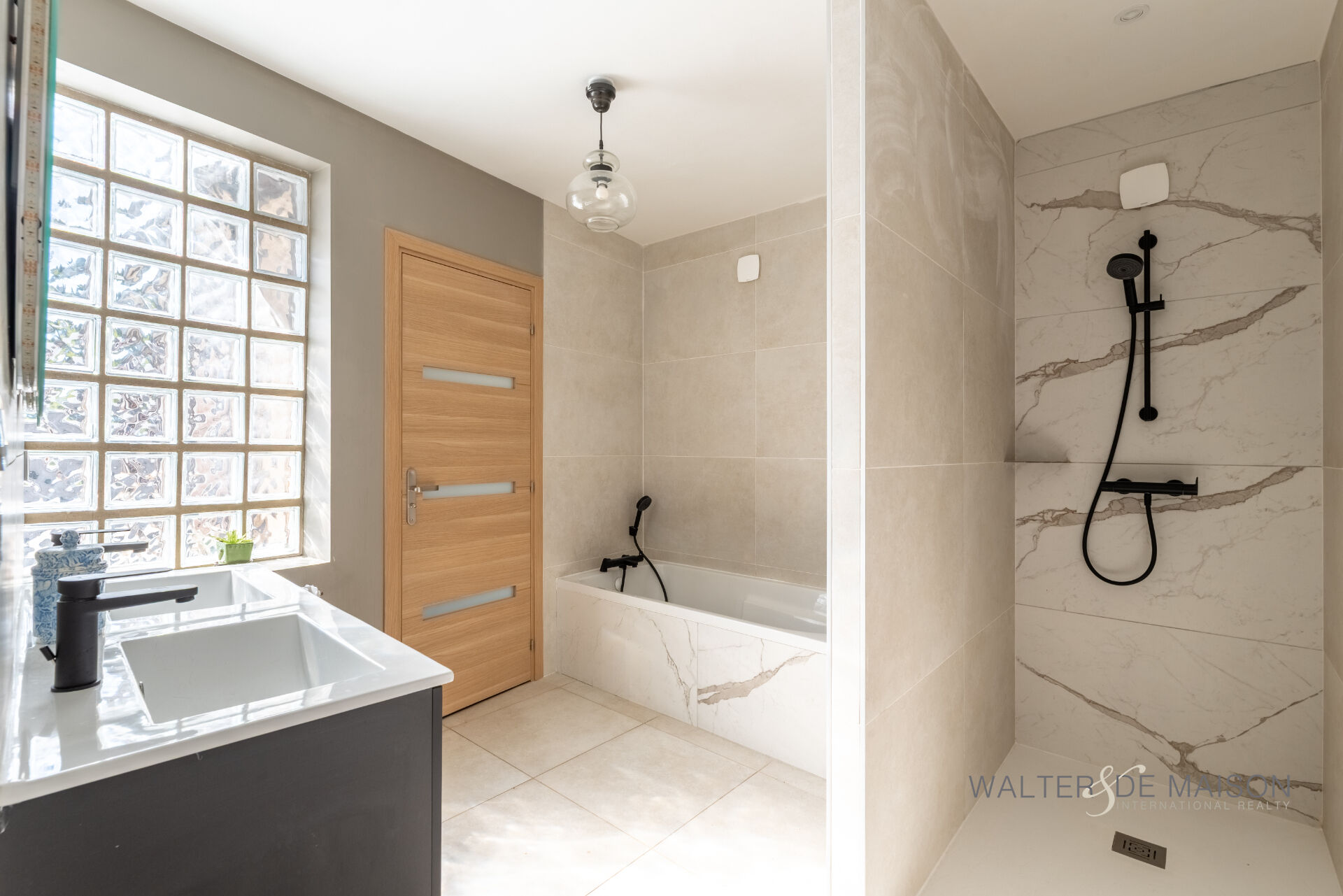 Une salle de bain, deux salles de douche, 4 toilettes et de nombreux rangements.
