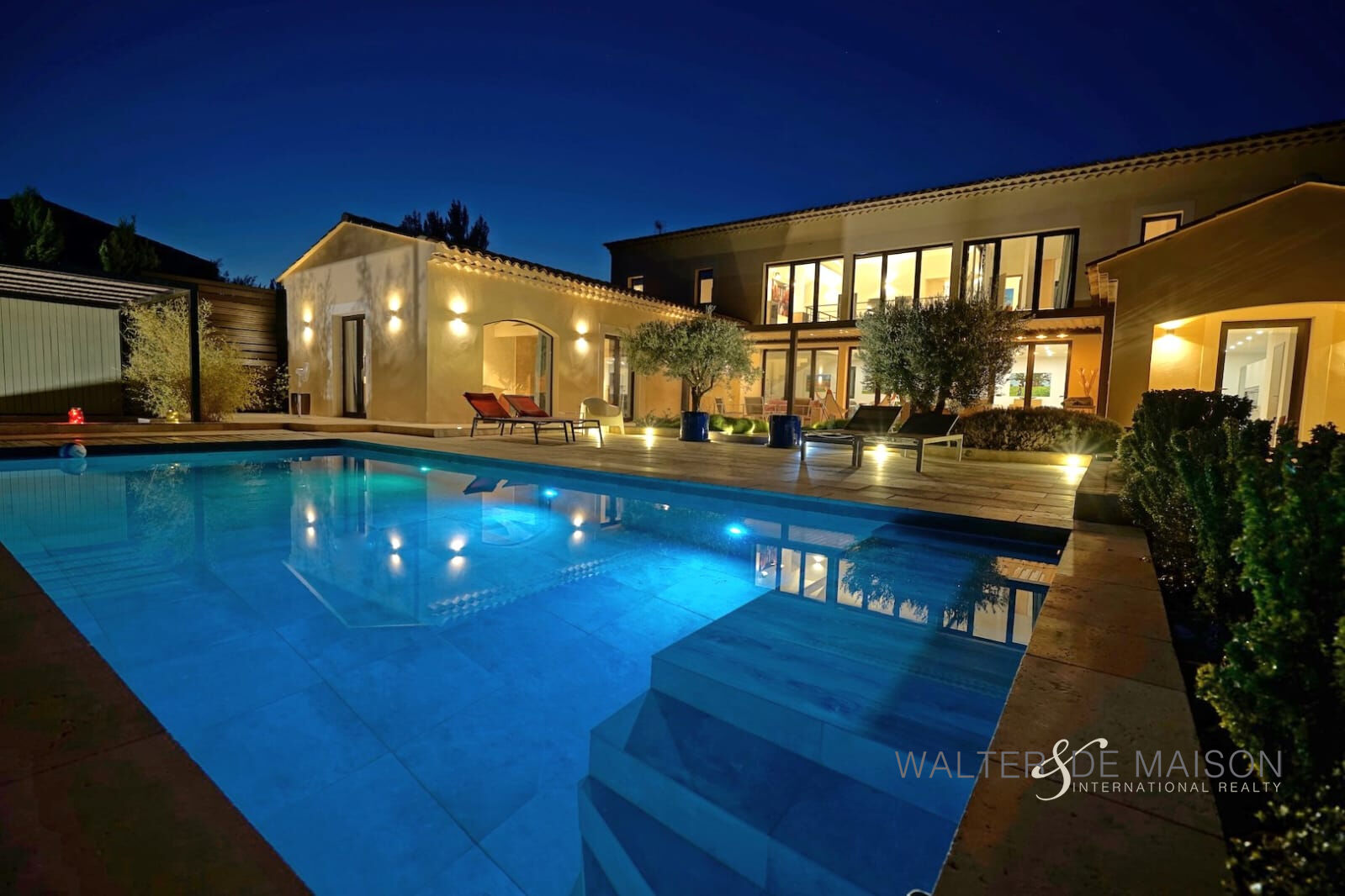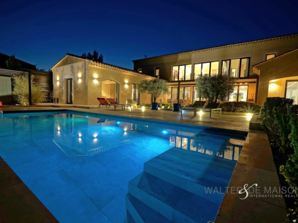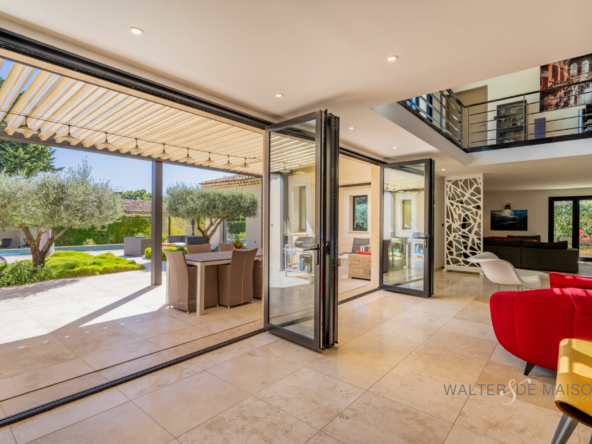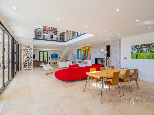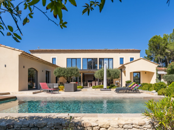 La propriété se compose d’une maison principale avec au rez-de-chaussée, une impressionnante pièce de vie d’environ 130 m², deux suites dont une Master de 58 m² donnant sur la piscine, une buanderie et un bureau.