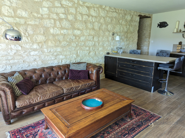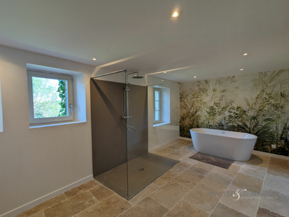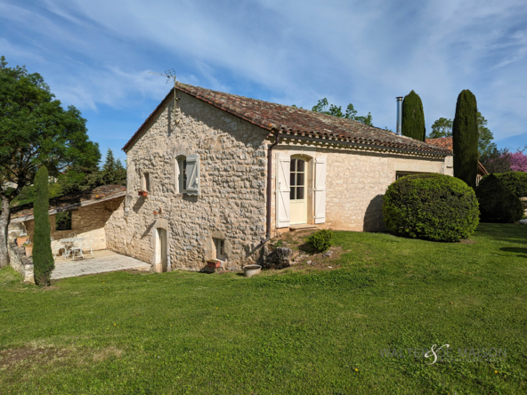 magnifique dépendance, toute en pierre également, abrite une salle de réception ainsi qu’une terrasse abritée pour les repas, configuration idéale pour recevoir un séminaire ou encore créer un logement individuel. Encore un peu plus loin, une charmante petite maison de plain pied de 60 m² comprenant un lumineux séjour avec cuisine, une grande salle d’eau et une chambre avec vue sur le parc que vous pourrez apprécier depuis une terrasse intimiste semi couverte. Sous la maison, cellier, buanderie, atelier et local piscine. De l’autre côté, vers la demeure principale, deux autres dépendances, la première aménagée en atelier et remise pour vélos et matériel de loisirs. La seconde, le “four à pain”, dans lequel une chambre d’hôtes a été aménagée. Tout ce potentiel est sublimé par un somptueux