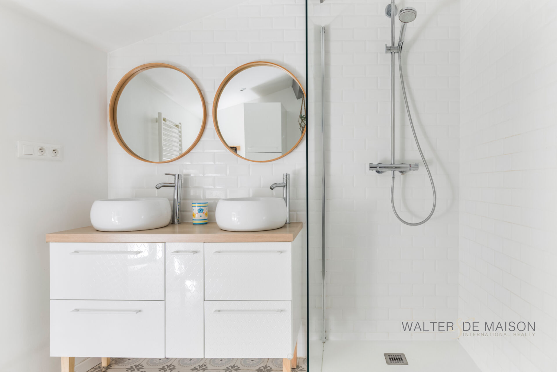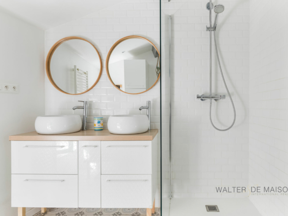 A l’étage, deux chambres une de 13,75m2 et la seconde15,05m2 avec dressing, une salle d’eau, avec double vasque, WC indépendant.