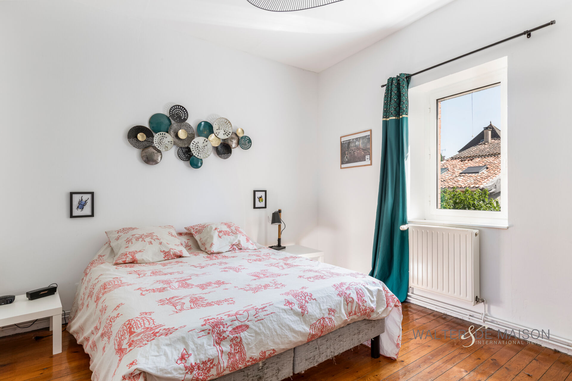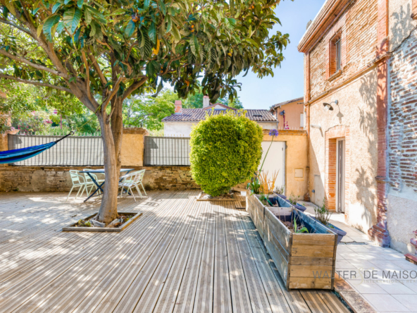 La maison s’ouvre sur une pièce de vie lumineuse, exposée sud, avec cuisine équipée et accès direct à un extérieur de 90m2, ombragé par un néflier du Japon.