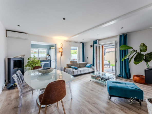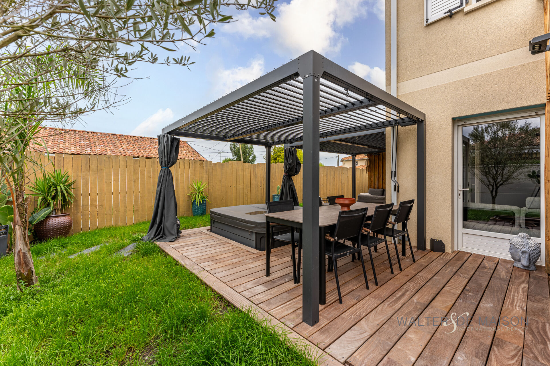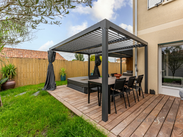 Dès l’entrée, vous découvrirez un placard intégré et un cellier, salon-séjour ouvrant sur une superbe terrasse de 35 m² en bois exotique, équipée de deux pergolas bio climatique, idéal pour vos moments de détente. Le jardin clos, exposé plein sud, est un véritable cocon de tranquillité.