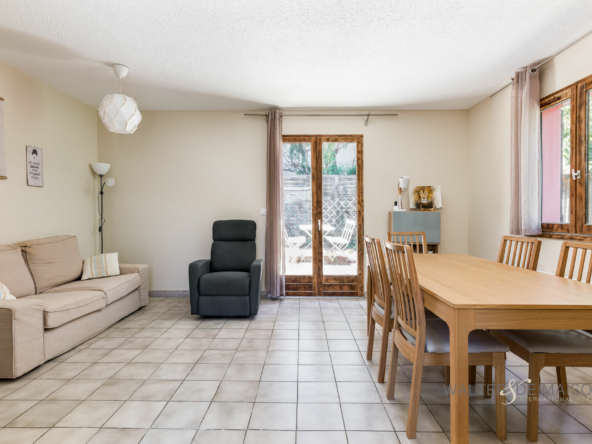 L’entrée lumineuse dessert un agréable séjour en triple exposition donnant sur une terrasse exposée Sud Ouest.
