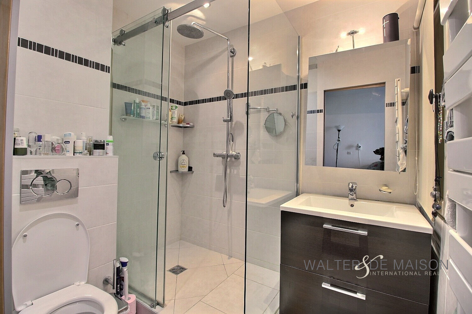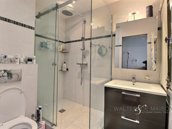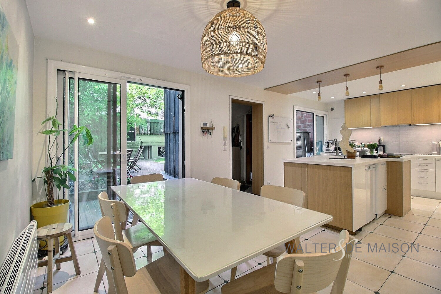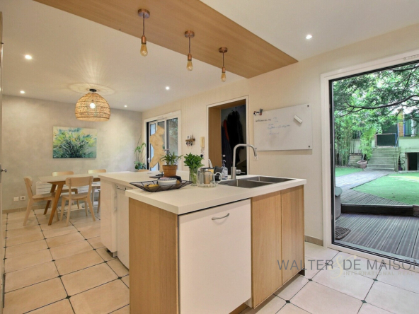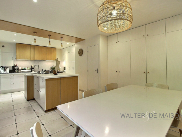 Elle se compose en rez-de-jardin, d’une cuisine aménagée/équipée pourvue de nombreux rangements, ouverte sur la salle à manger, et d’un w.c indépendant,