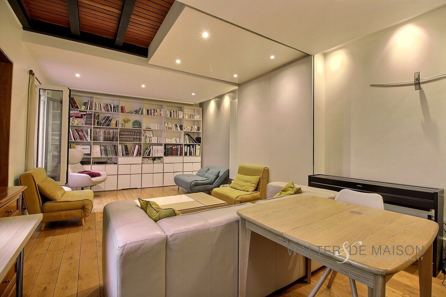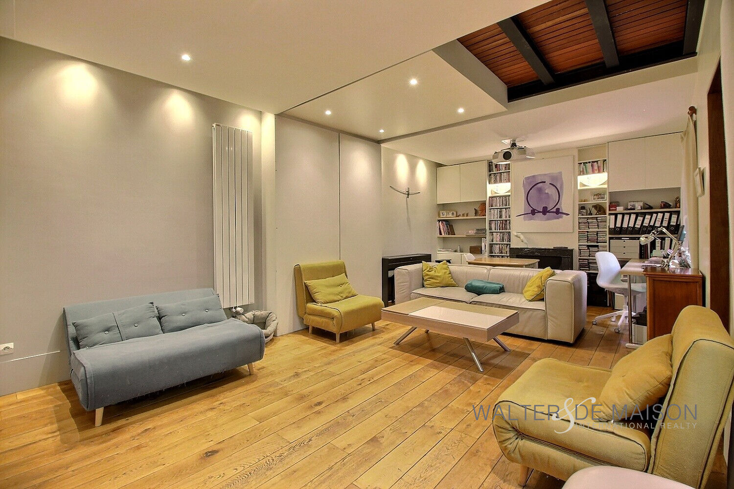 Au premier étage, d’un séjour de 29,22m² dotée d’une bibliothèque et d’une cheminée,