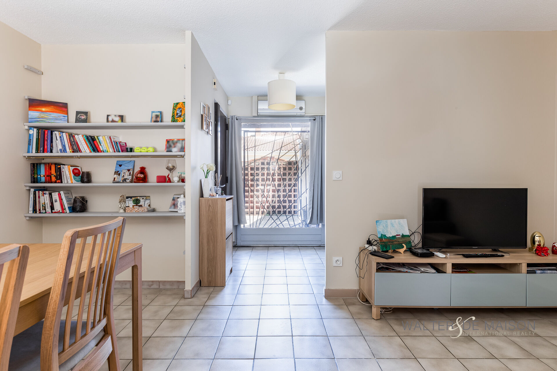 L’entrée lumineuse dessert un agréable séjour en triple exposition donnant sur une terrasse exposée Sud Ouest.