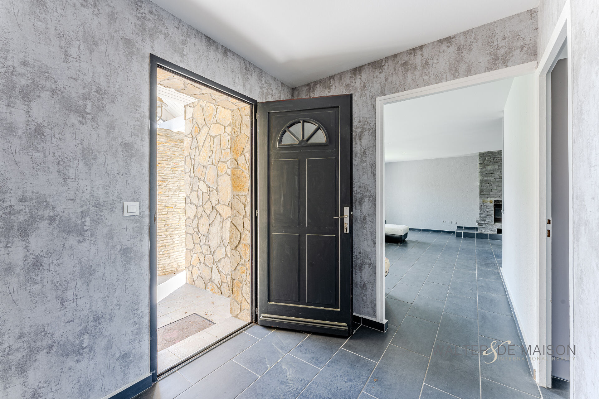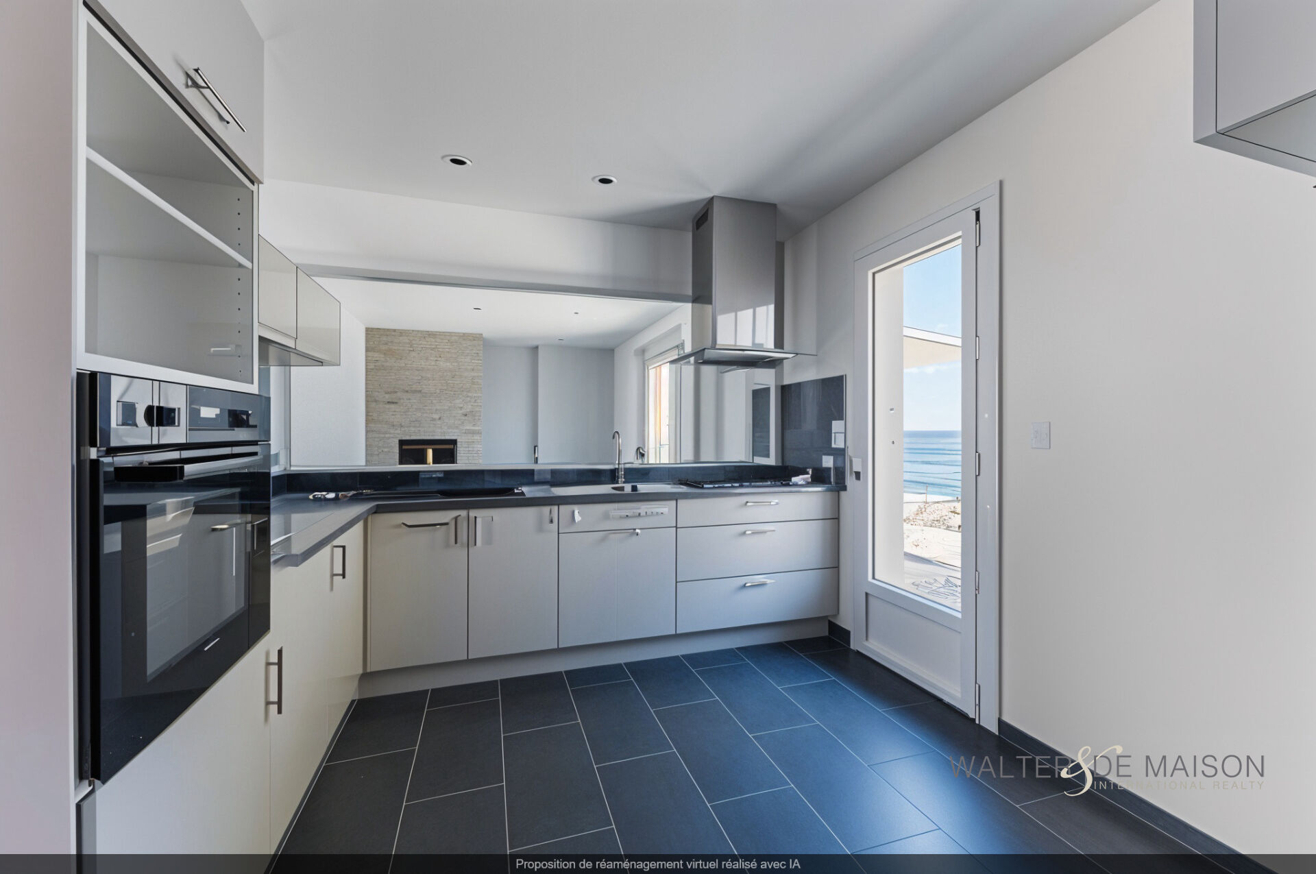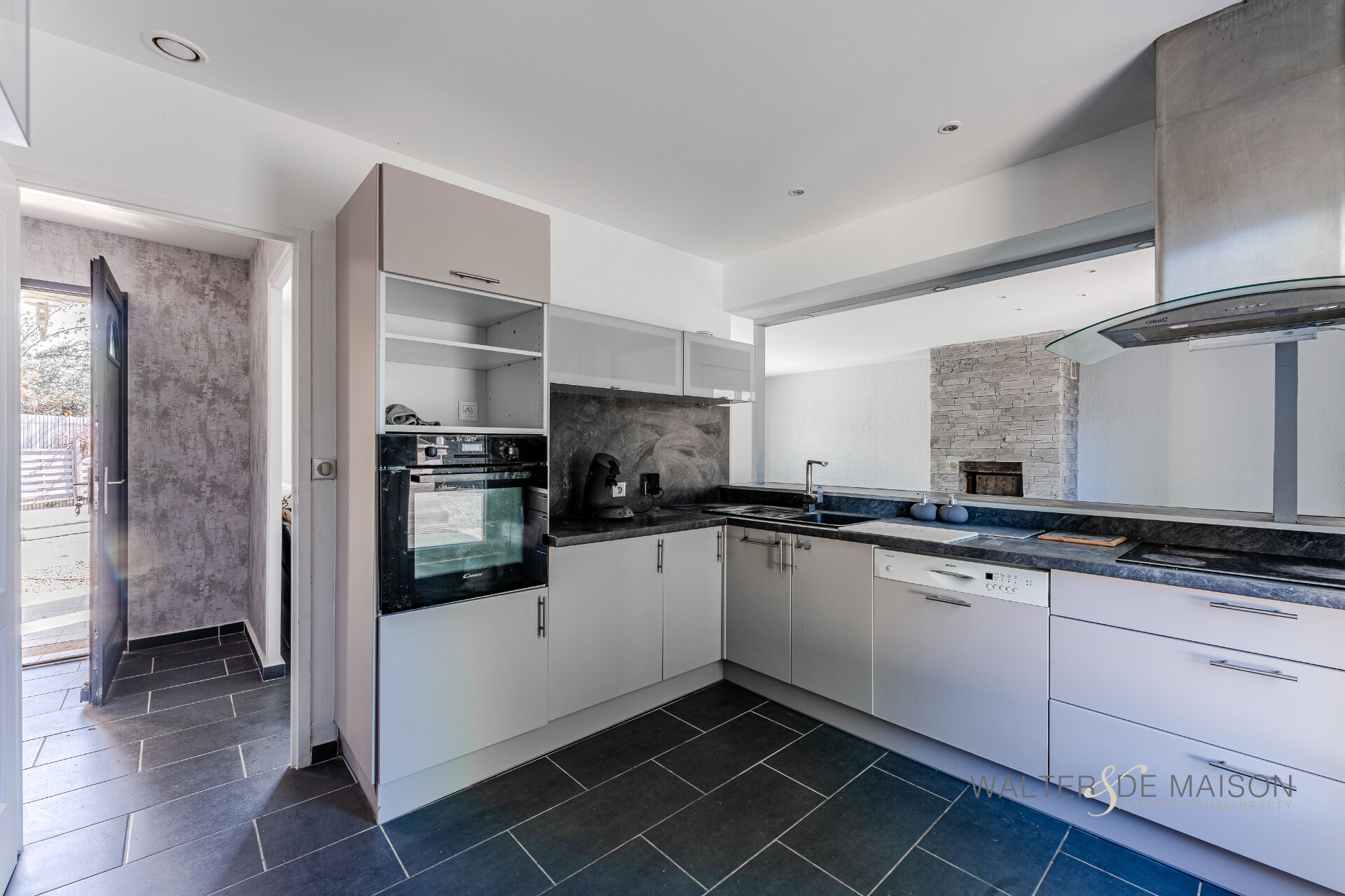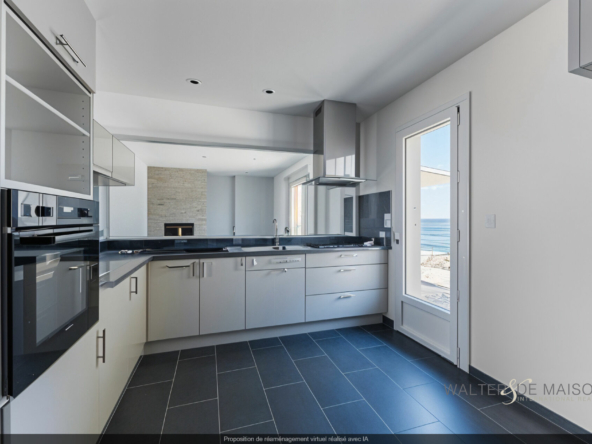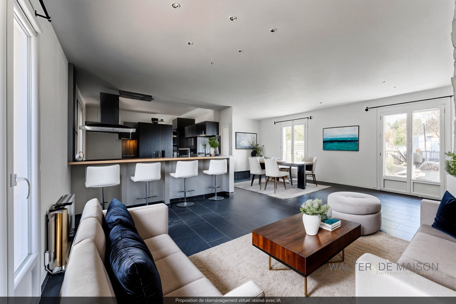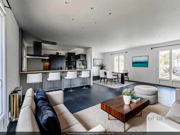 ESPACE VIE : Grand séjour traversant de 37 m² avec cheminée, cuisine semi-ouverte équipée.