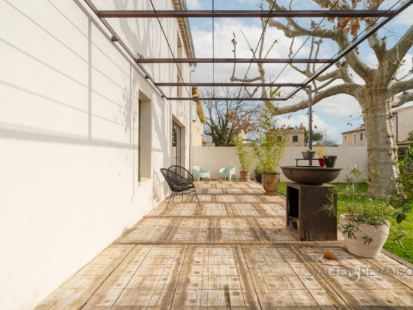 Coté extérieur, sur la terrasse vous pourrez passer de douces soirées d’été sous le monumental platane qui trône dans le jardin.