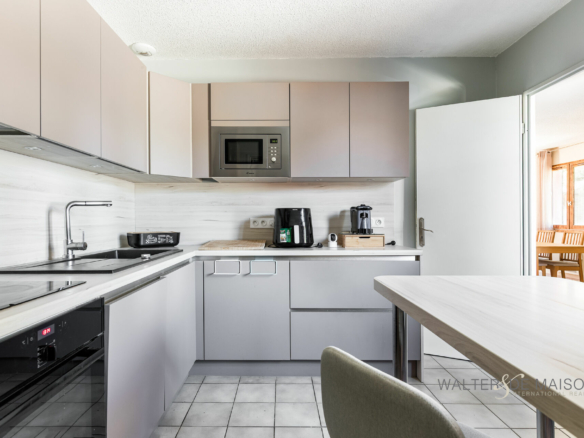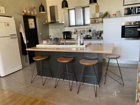 Cuisine ouverte équipée avec îlot central, idéale pour les moments conviviaux