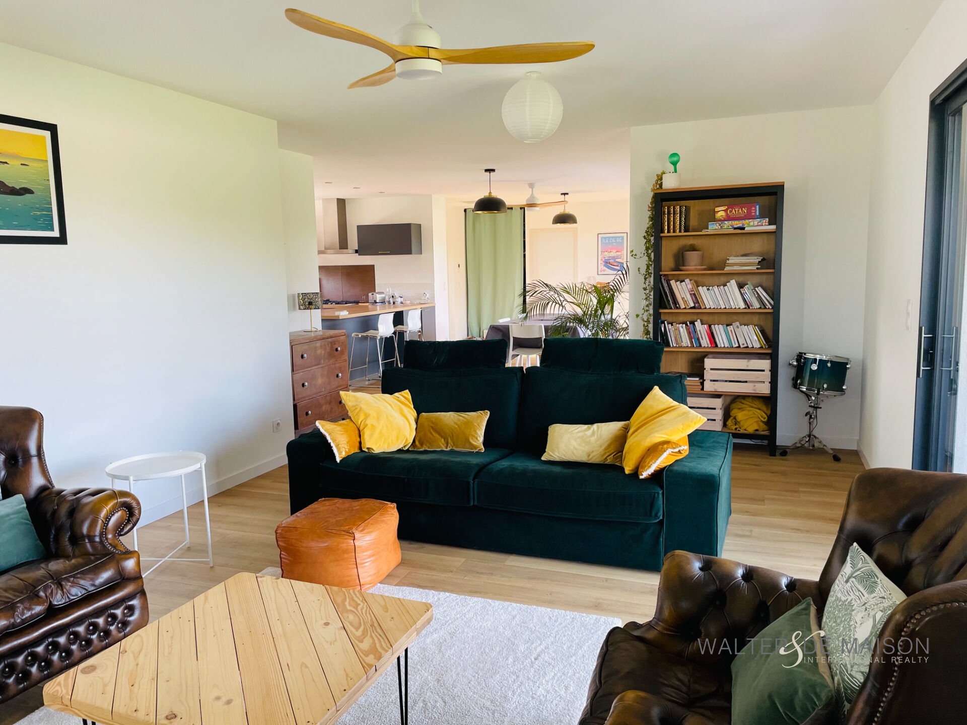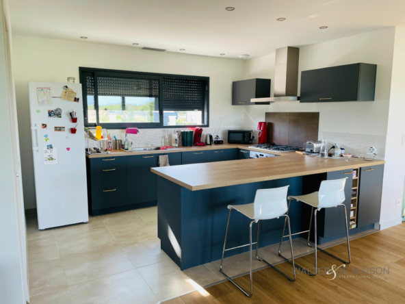 Une cuisine ouverte entièrement équipée (four Electrolux, lave-vaisselle Bosch, hotte Falmec) avec un bar convivial, parfait pour vos soirées festives.