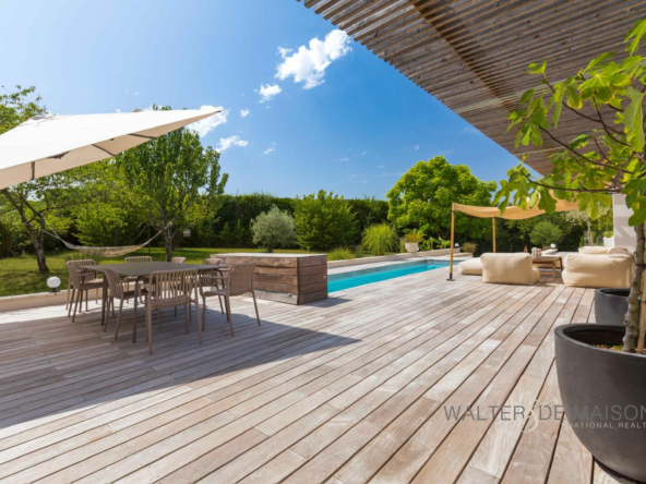A l’extérieur, une splendide terrasse en bois de 180 m² prolonge les pièces de vie et dévoile une piscine confidentielle, à l’abri des regards… un véritable coin de paradis.