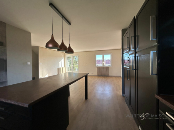 La pièce de vie est spacieuse et lumineuse, avec une cuisine ouverte qui apporte convivialité et confort au quotidien.