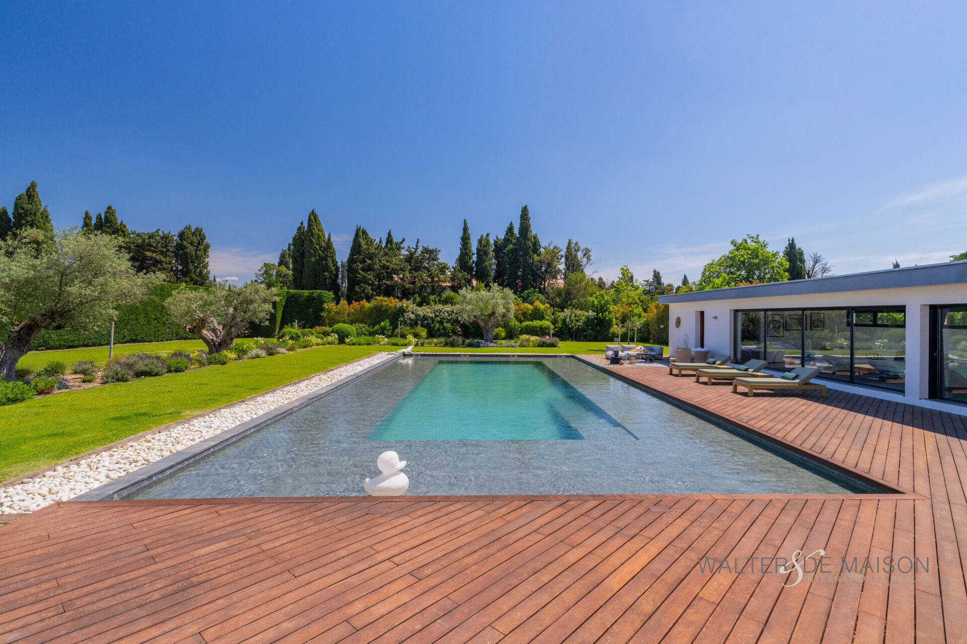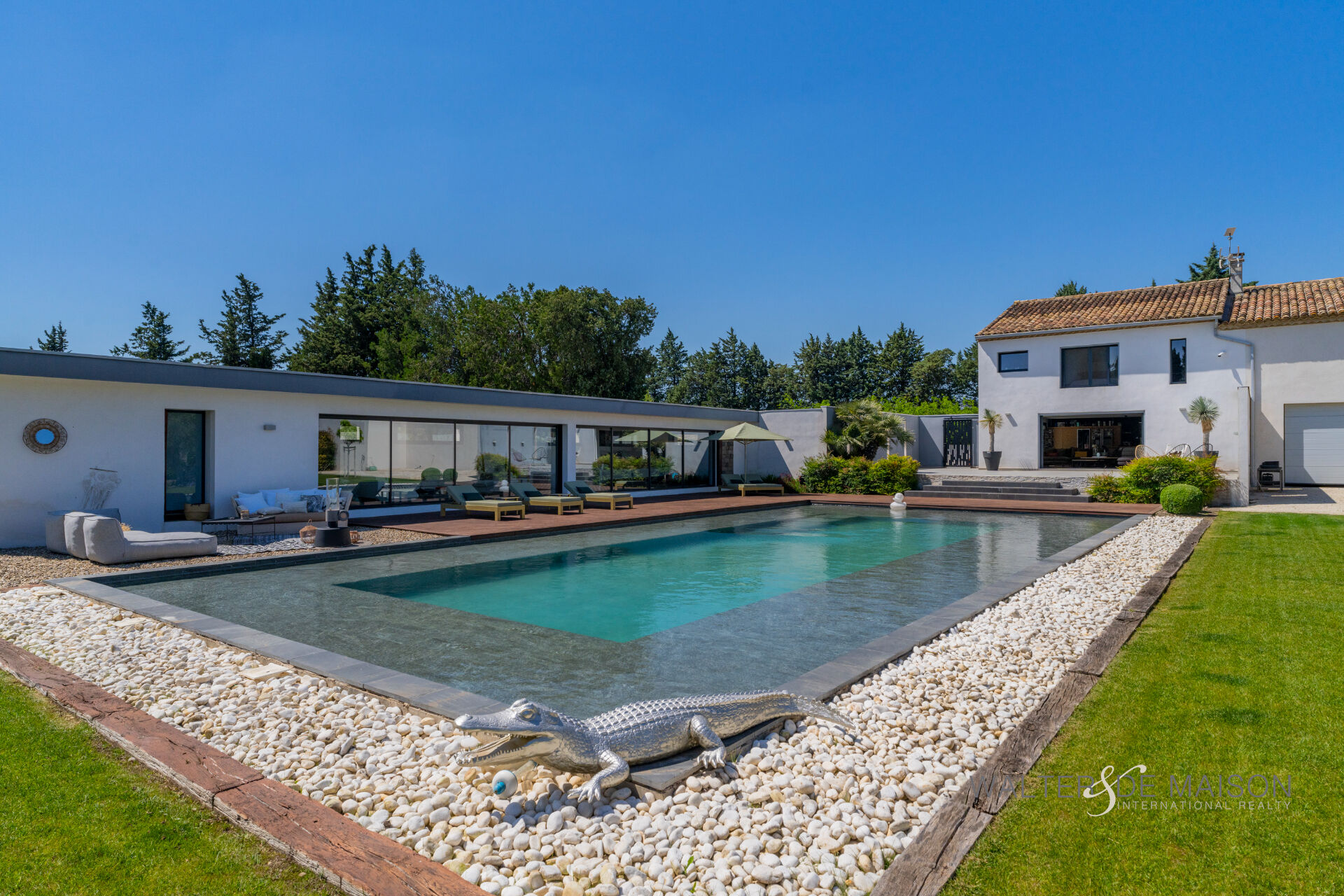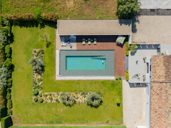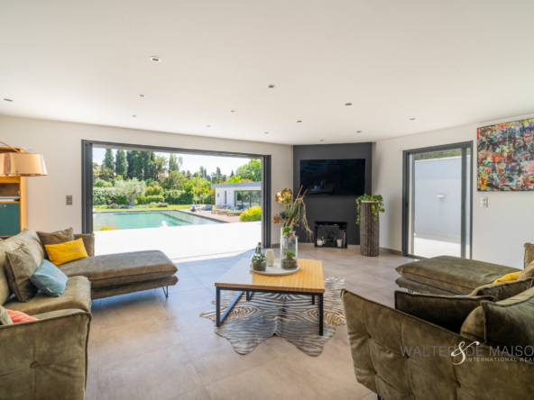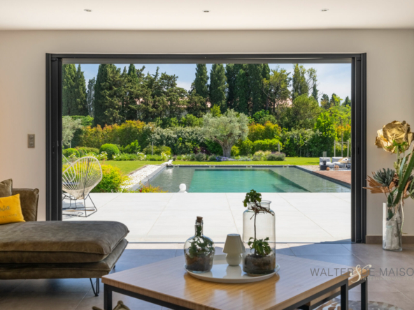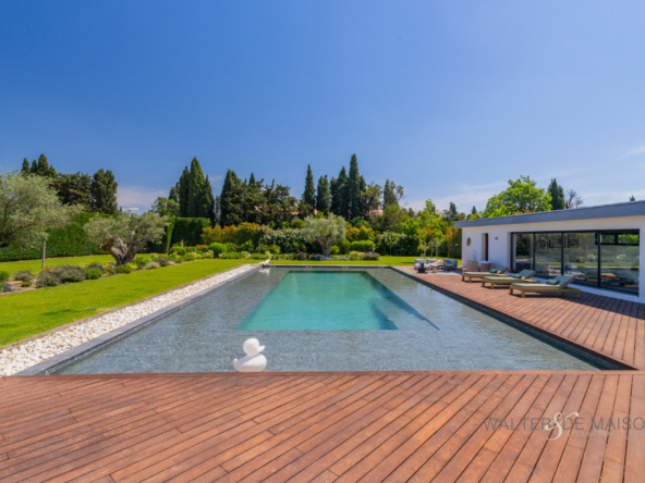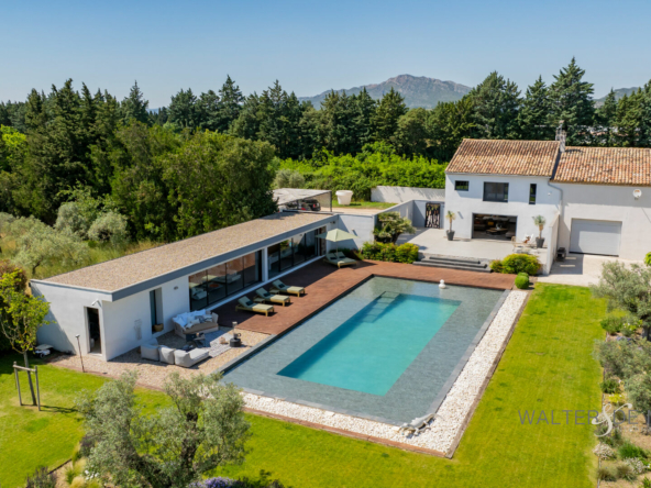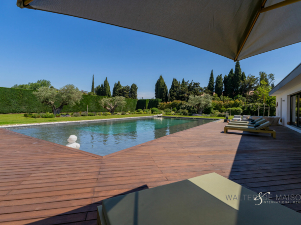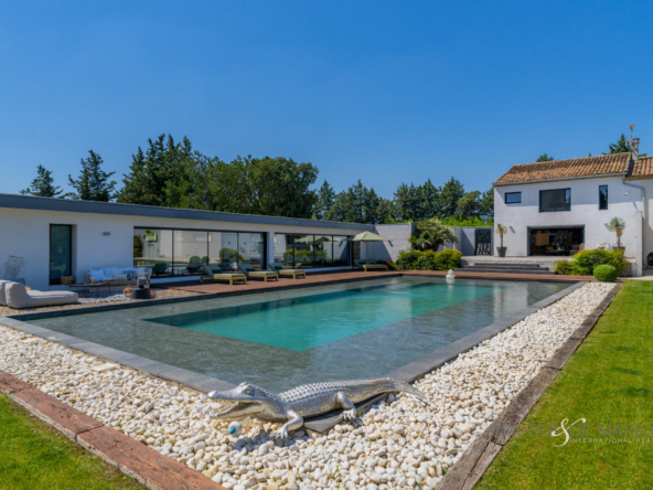 Sur la commune d’Eyguières idéalement située entre Aix en Provence et la porte des Alpilles , cette belle contemporaine s’ouvre plein sud sur une piscine d’exception (19×10) imaginée par le propriétaire pour se rafraîchir et nager lors des chaudes journées estivales.