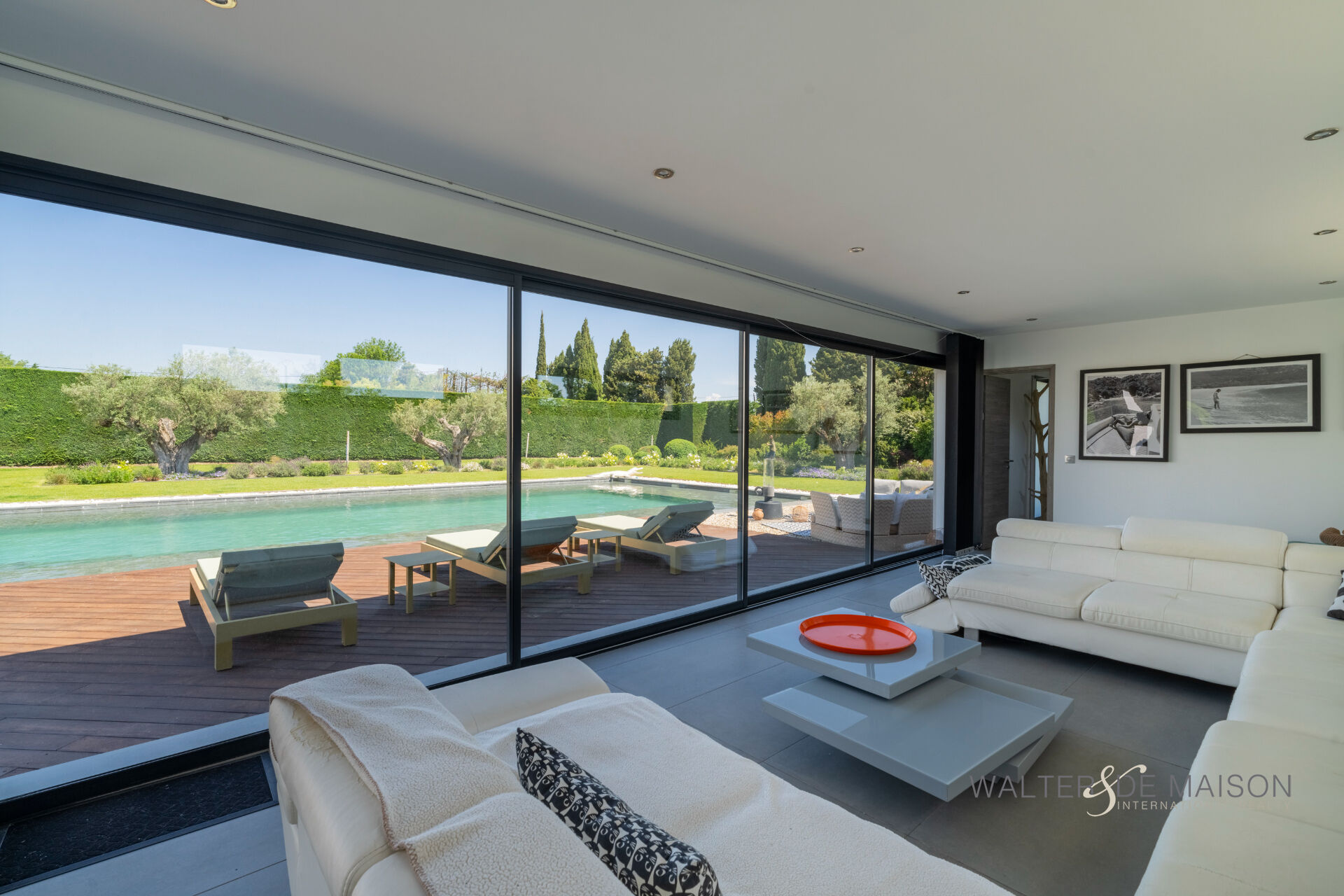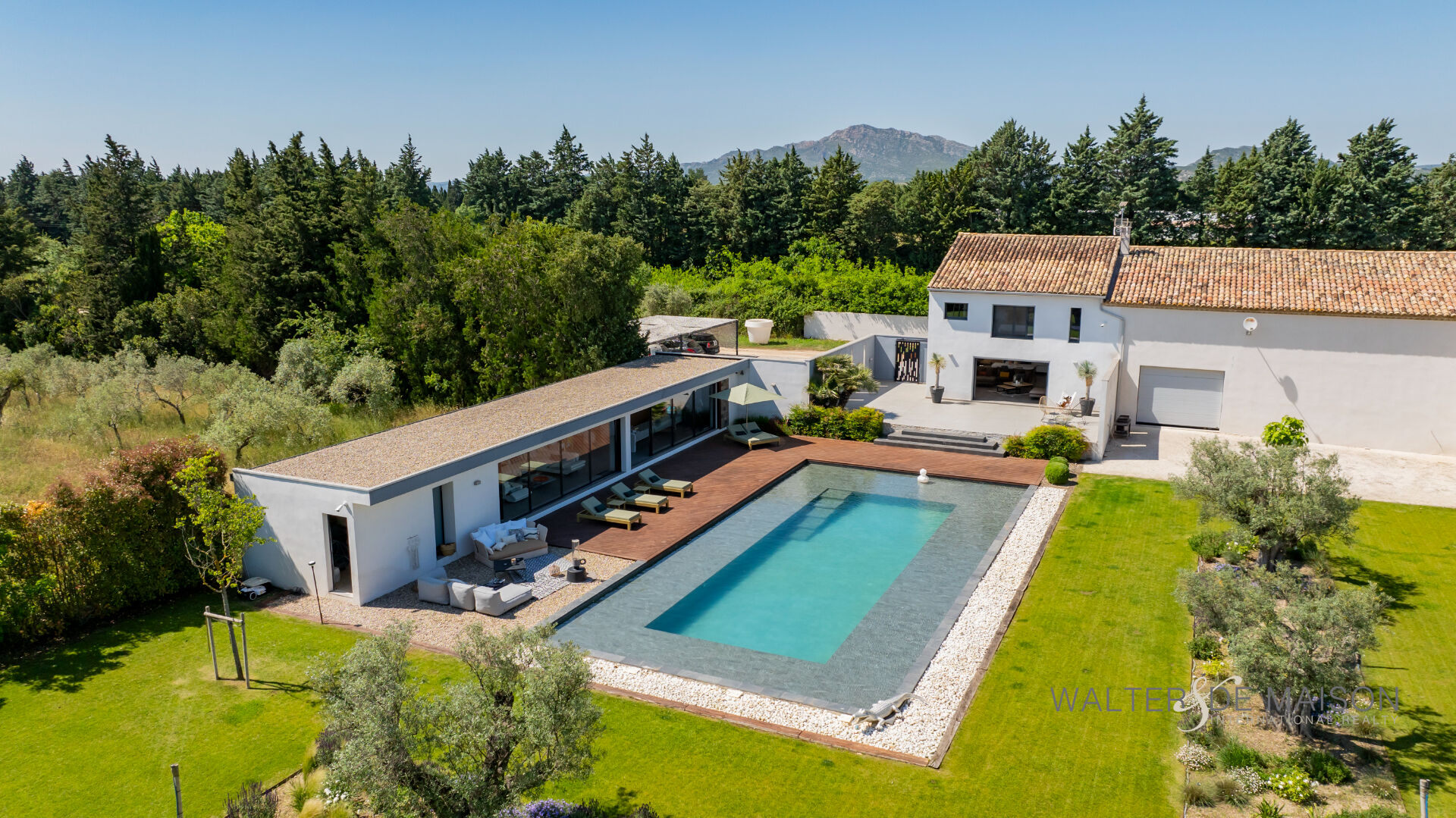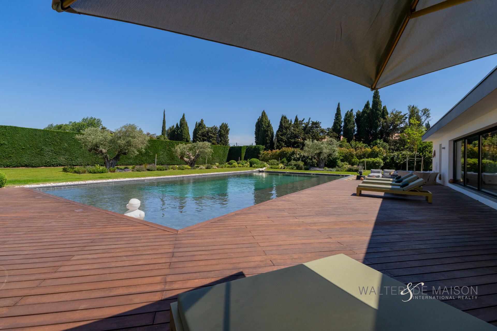 Sur la commune d’Eyguières idéalement située entre Aix en Provence et la porte des Alpilles , cette belle contemporaine s’ouvre plein sud sur une piscine d’exception (19×10) imaginée par le propriétaire pour se rafraîchir et nager lors des chaudes journées estivales.