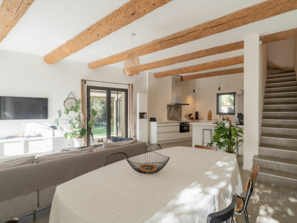 La maisons se compose d’un magnifique salon avec pierre ancienne et poutre apparente avec sa cuisine entièrement équipée , cette lumineuse pièce de vie s’ouvre sur deux terrasses , une arrière cuisine et un wc complète le rdc.