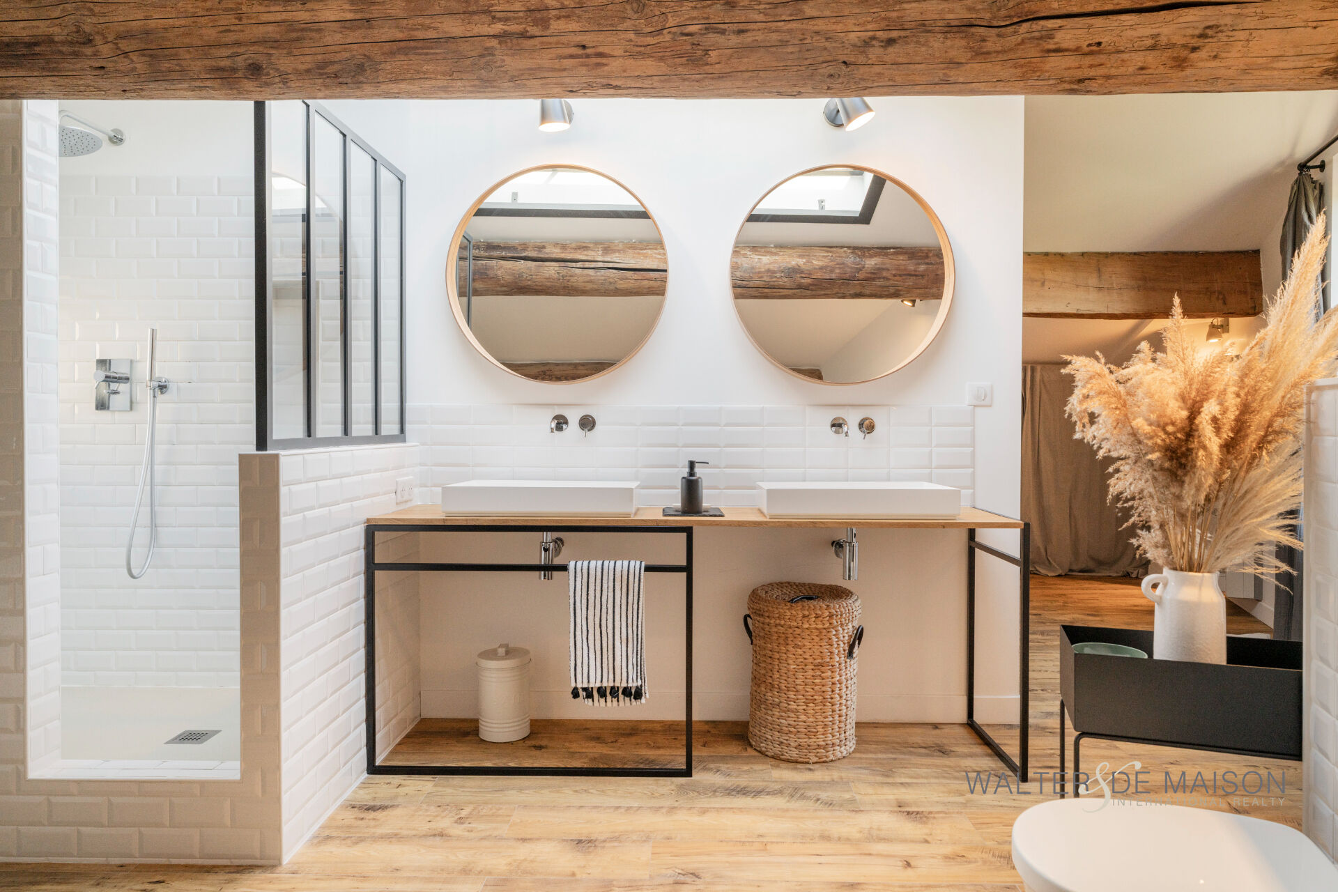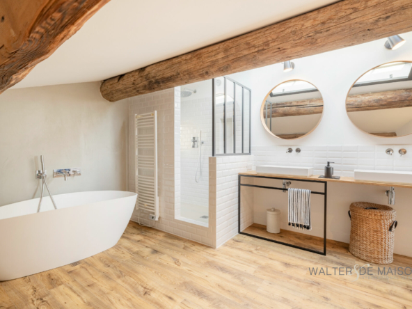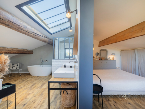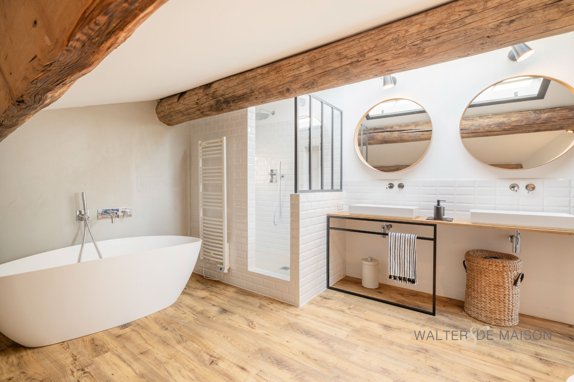 Au dernier étage une sublime suite parentale avec une salle de bain avec baignoire et douche à l’italienne ou l’on peut observer le ciel par son puit de lumière.