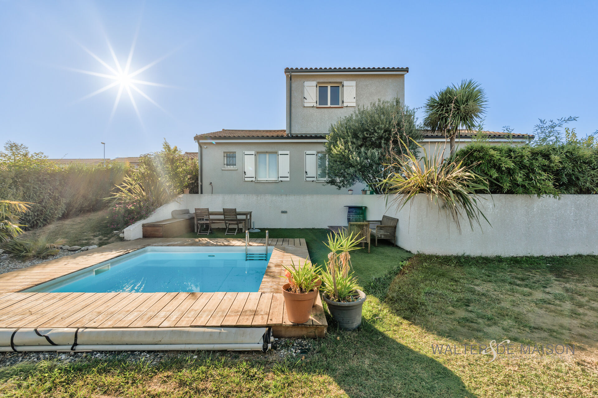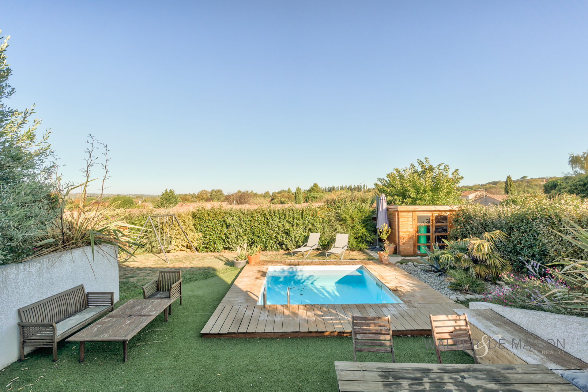 Dans le jardin intimiste de 725m2, plusieurs espaces vous permettent de profiter des beaux jours, 2 terrasses, une piscine de 10m2 avec terrasse et bain de soleil, un espace balançoire arboré.