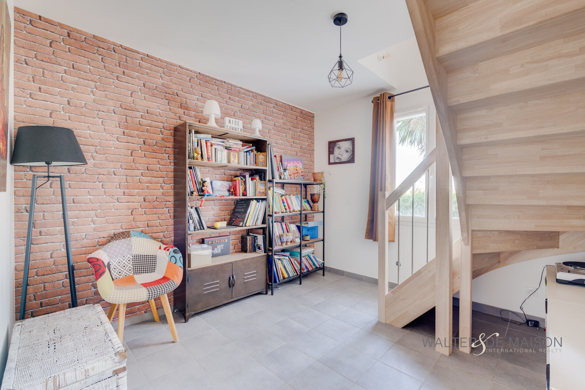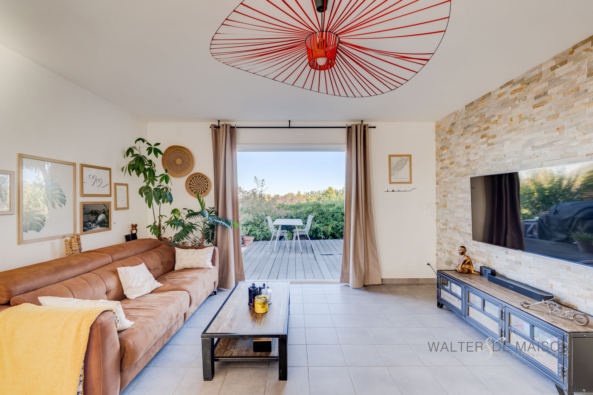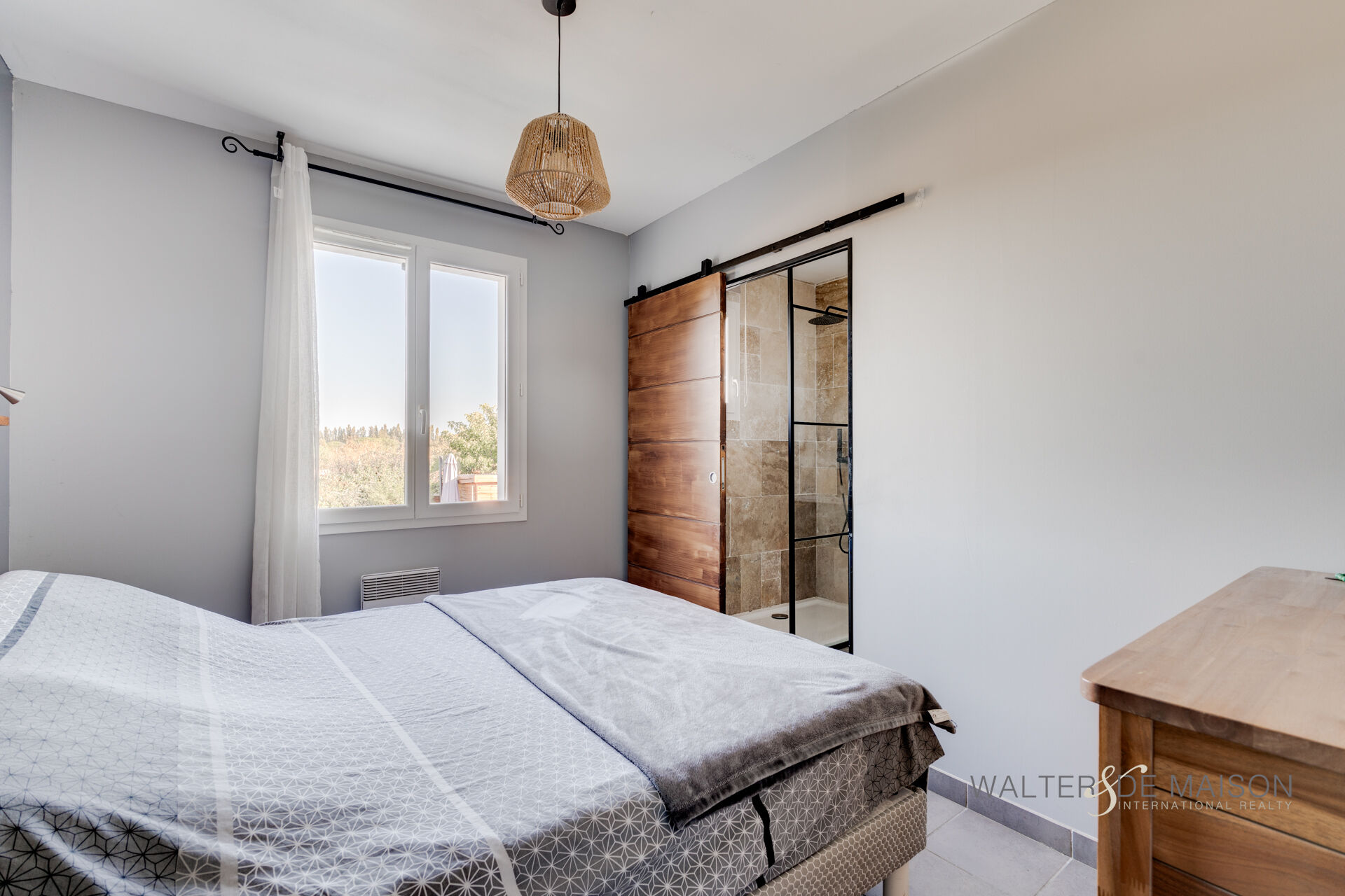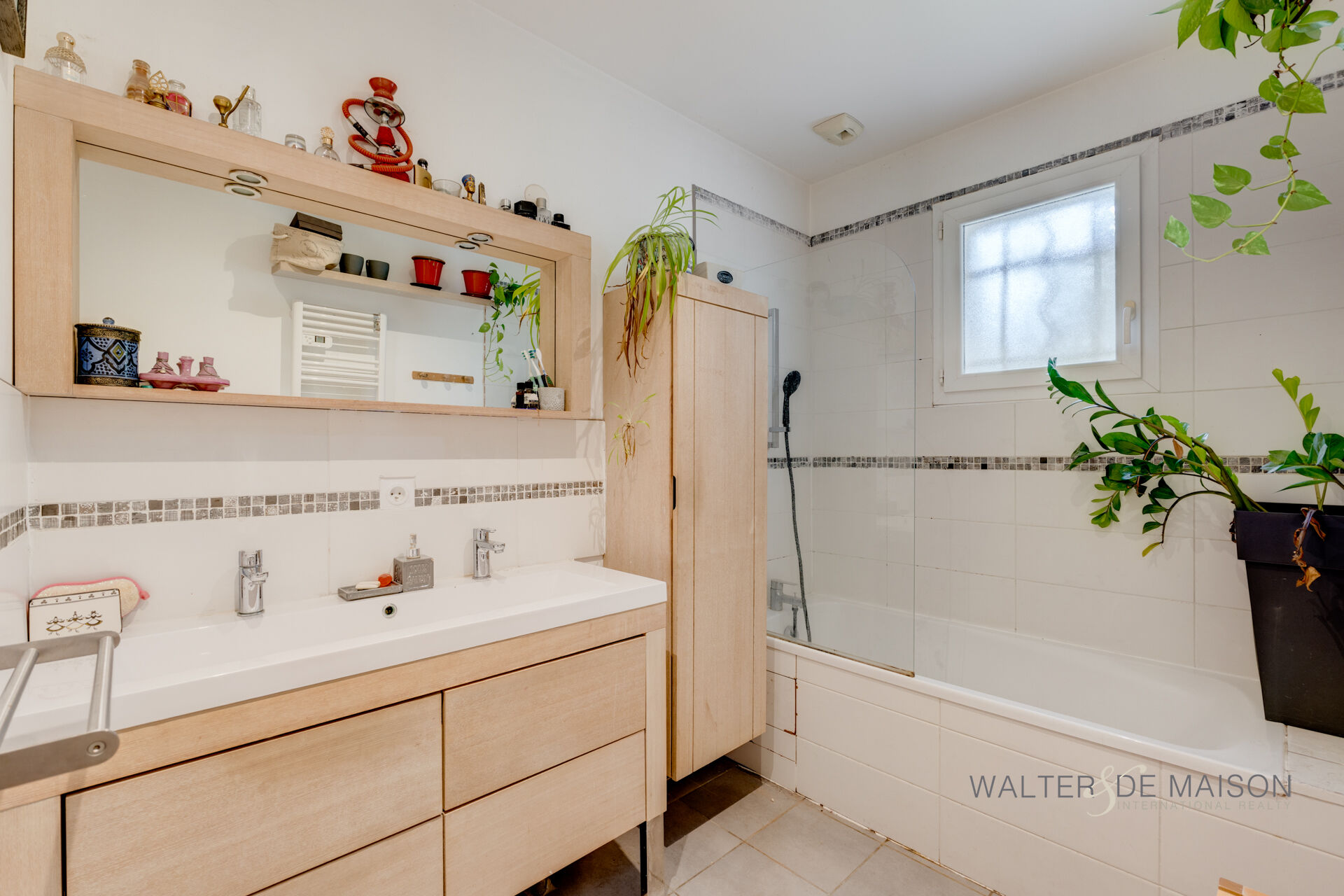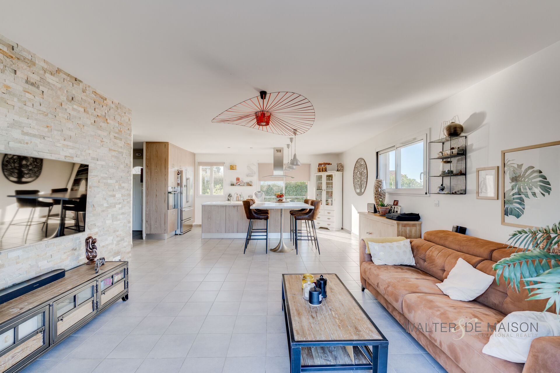 L’entrée dessert une entrée avec rangements menant sur une pièce de vie lumineuse grâce à sa double exposition, elle comprend une cuisine américaine dinatoire, aménagée et équipée donnant sur une terrasse exposée Sud/Est. Le séjour donne également sur une terrasse et le jardin.