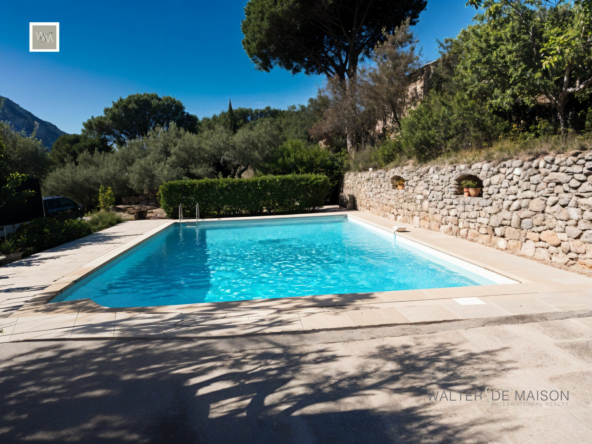 A l’extérieur, un terrain de plus de 2 000 m² planté d’oliviers centenaires vous plonge dans une ambiance paisible et méditerranéenne. Une piscine entourée de restanques en pierres sèches complète parfaitement cet écrin de verdure.