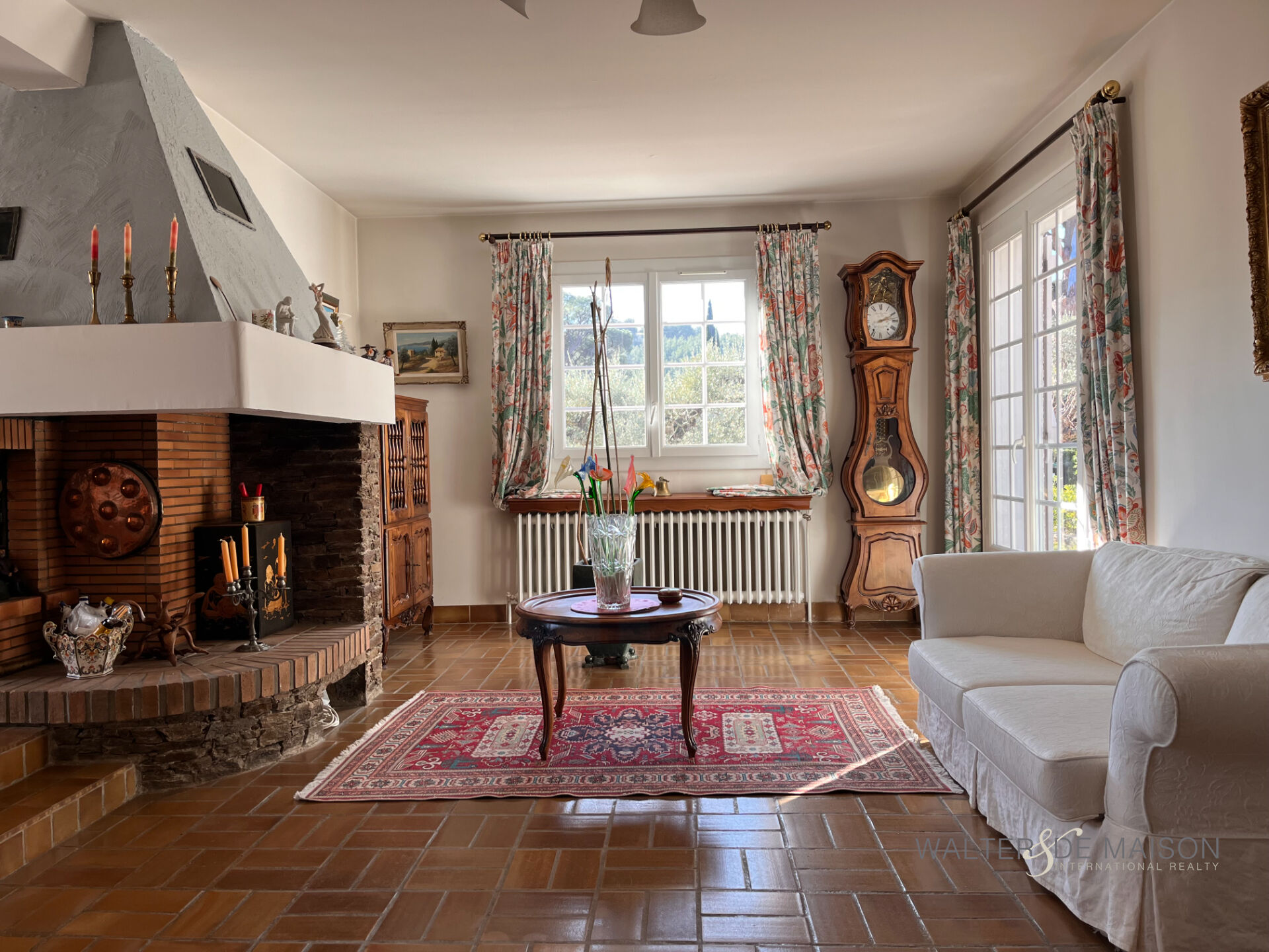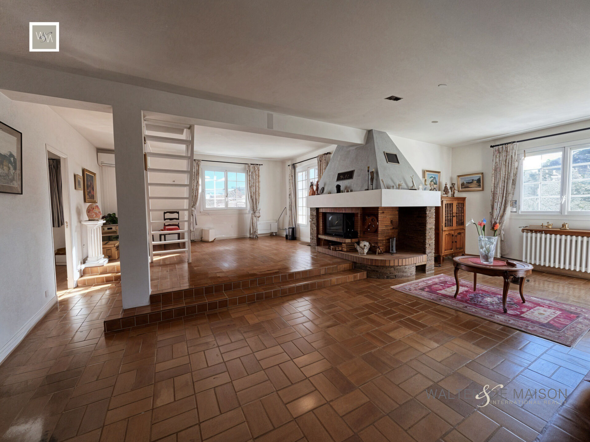 Le double salon, spacieux et baigné de lumière, s’ouvre sur une belle cheminée qui donne tout son charme à la pièce de vie.