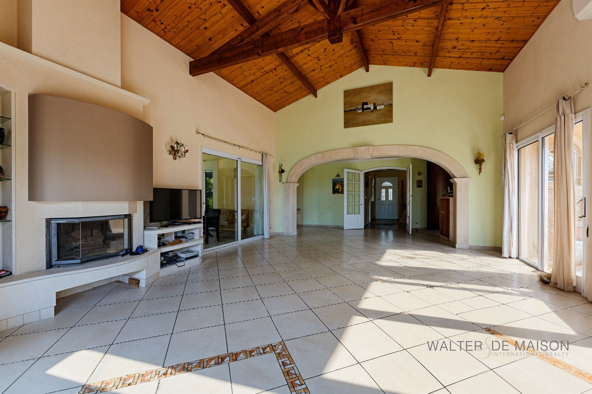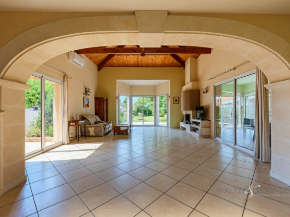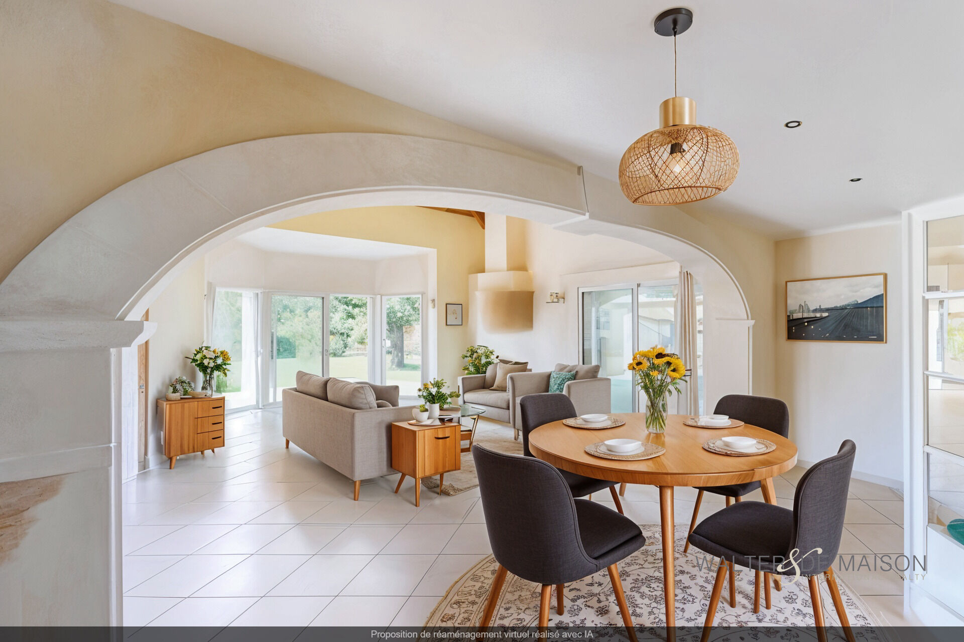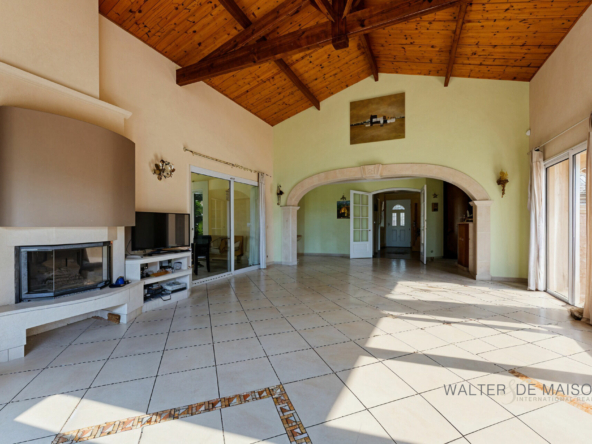 Elle se compose d’une pièce de vie lumineuse de plus de 50 m² avec plafond rampant, cheminée et grande baie vitrée ouvrant sur une véranda spacieuse, cuisine équipée avec coin bar et cellier.
