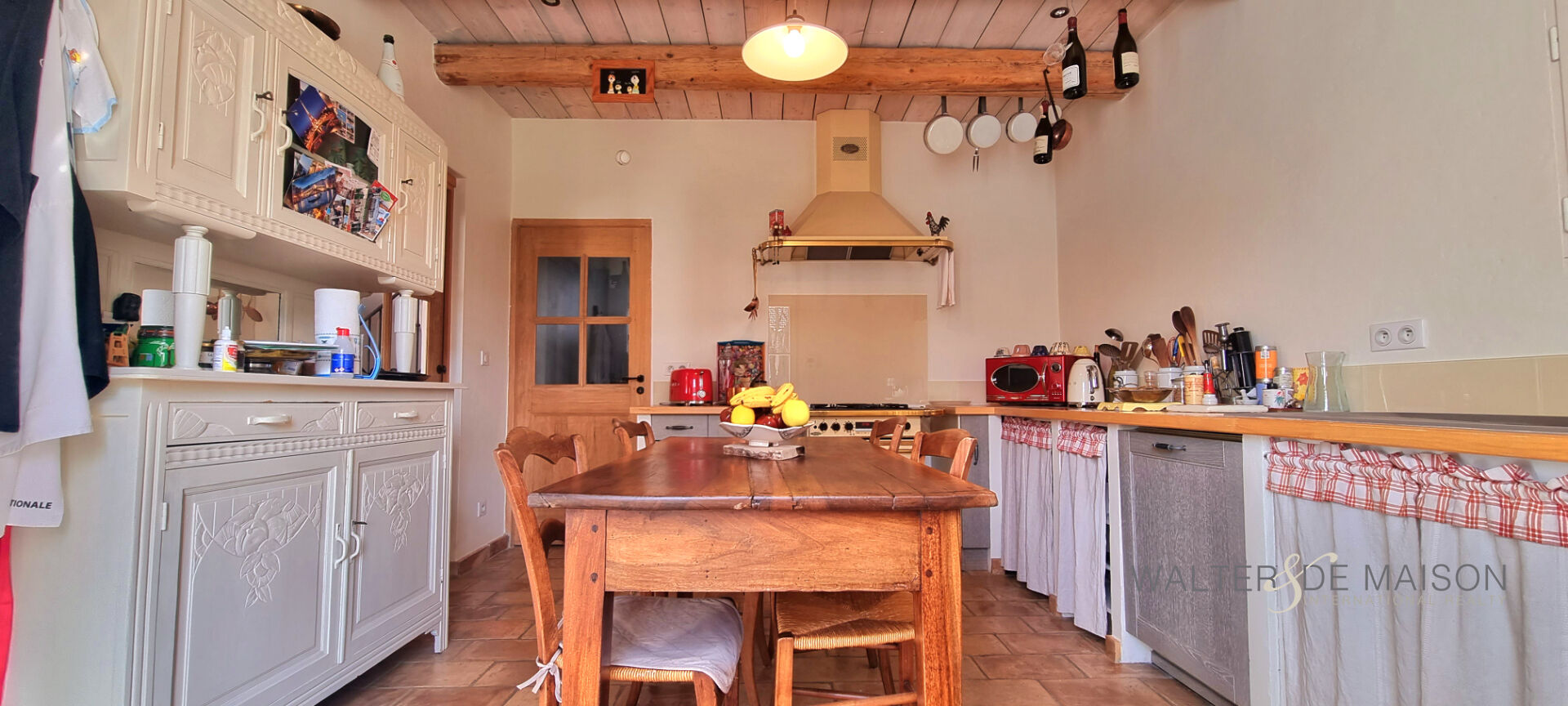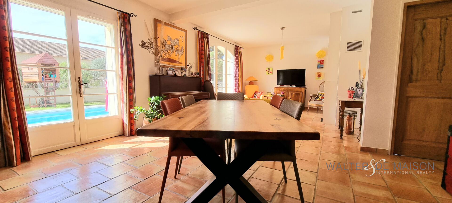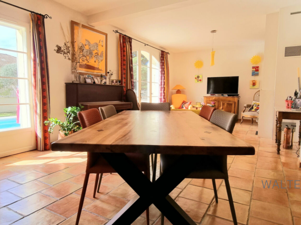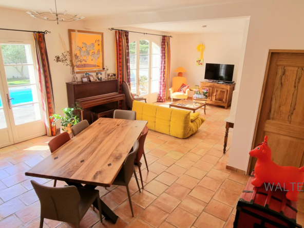 à l’extérieur, un jardin ou vous pourrez profiter d’une grande terrasse ombragée avec barbecue , d’une belle piscine avec volet électrique. Énorme avantage pour une maison situé en plein centre village, un garage de 32m² + places de parking privé sont à votre disposition.