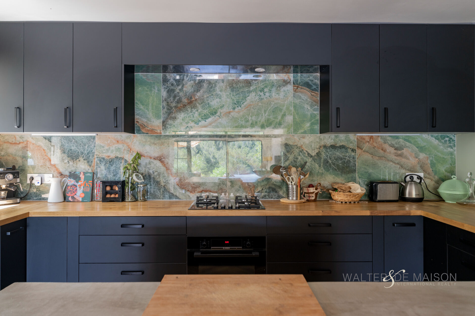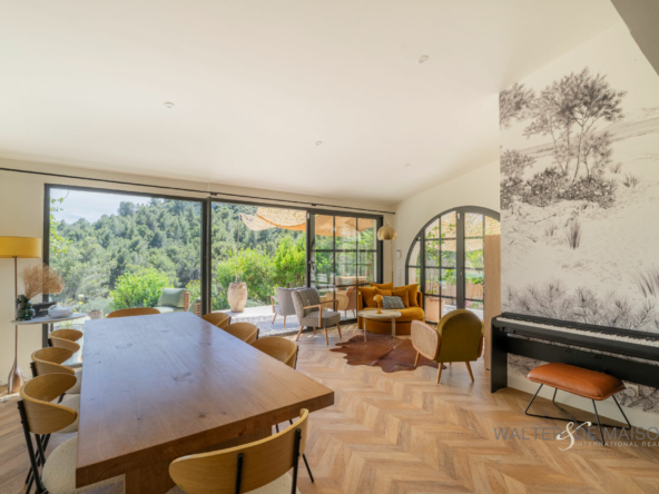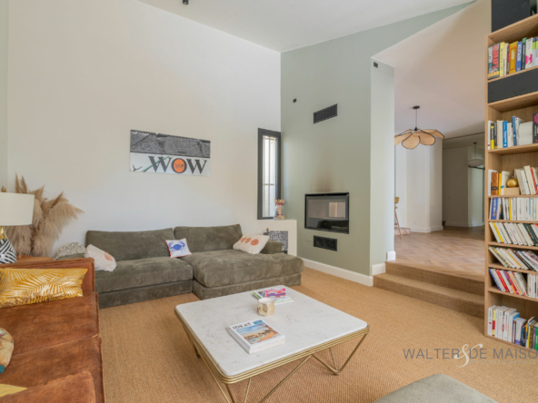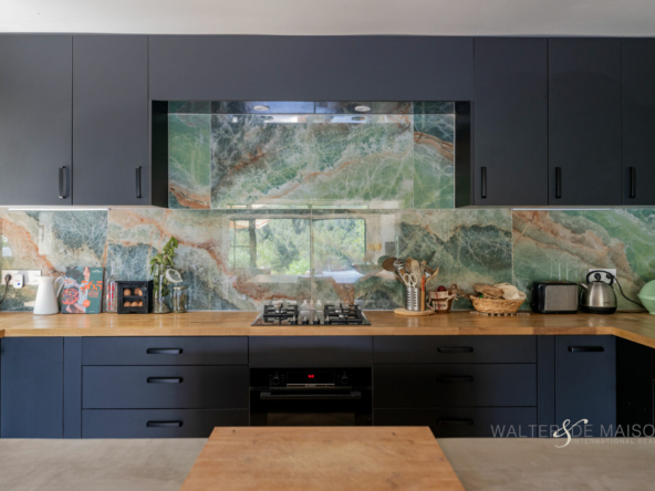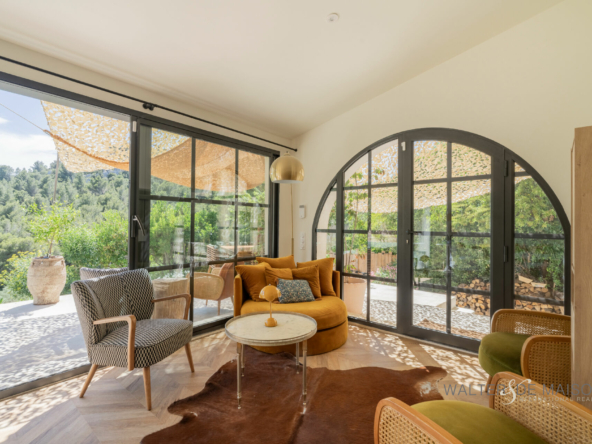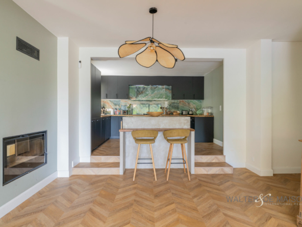 Dès l’entrée, la maison dévoile une atmosphère apaisante, baignée de lumière grâce à une grande pièce à vivre d’environ 100m² : une grande cuisine ouverte très fonctionnelle, un salon/salle de cinéma avec cheminée double foyer et une salle à manger sous verrière. L’ensemble est orienté plein sud, avec de larges ouvertures donnant sur le jardin et les Alpilles en toile de fond.