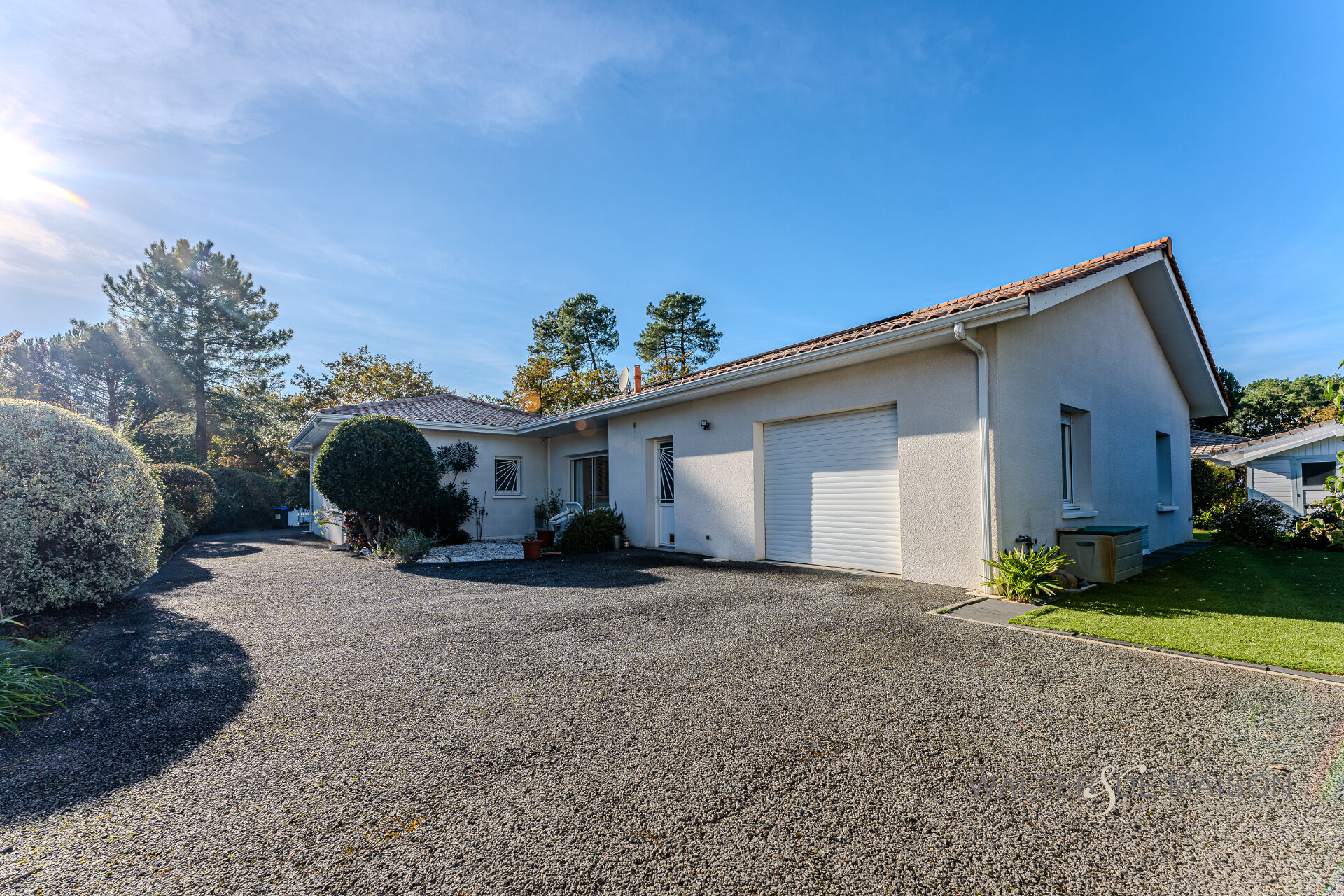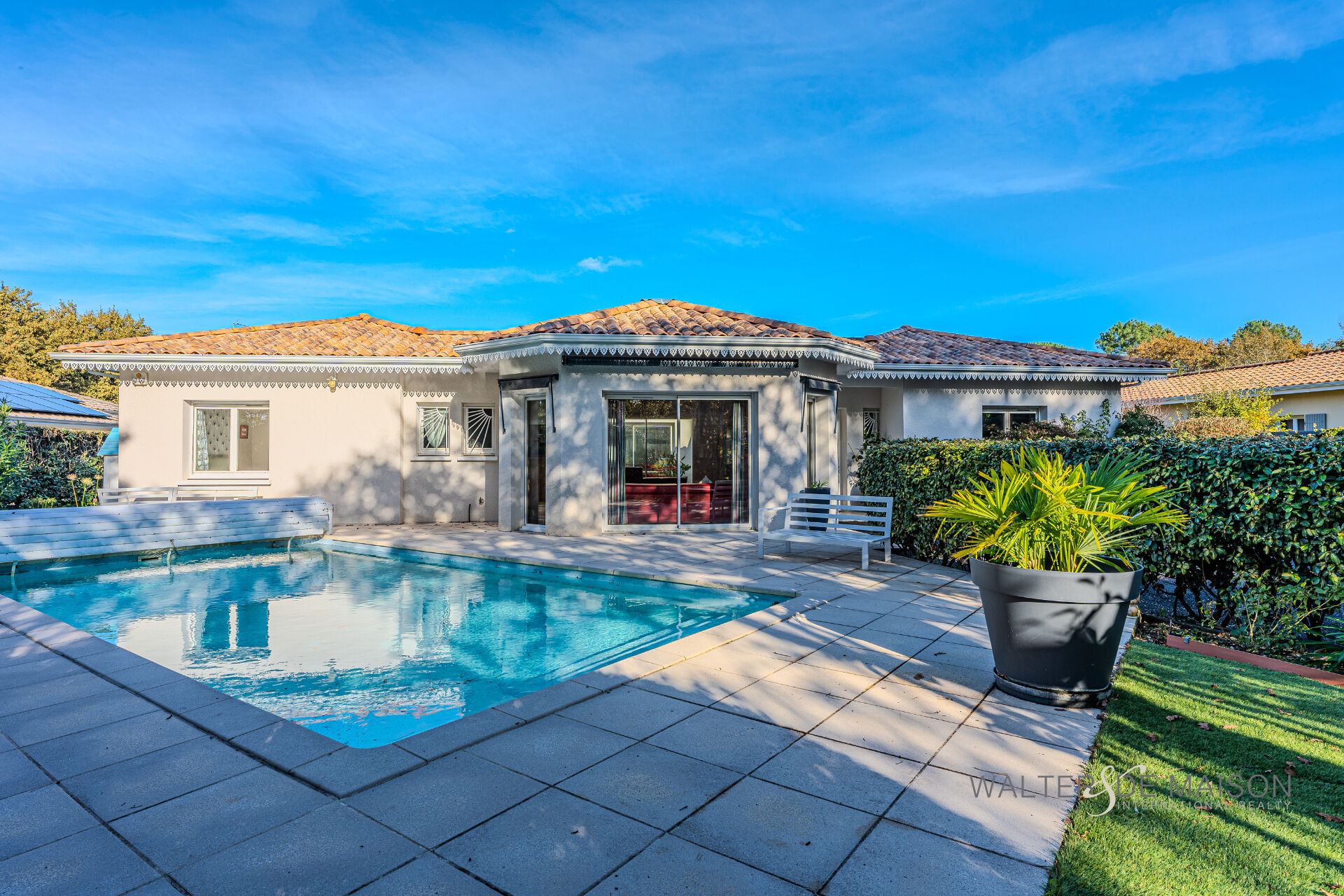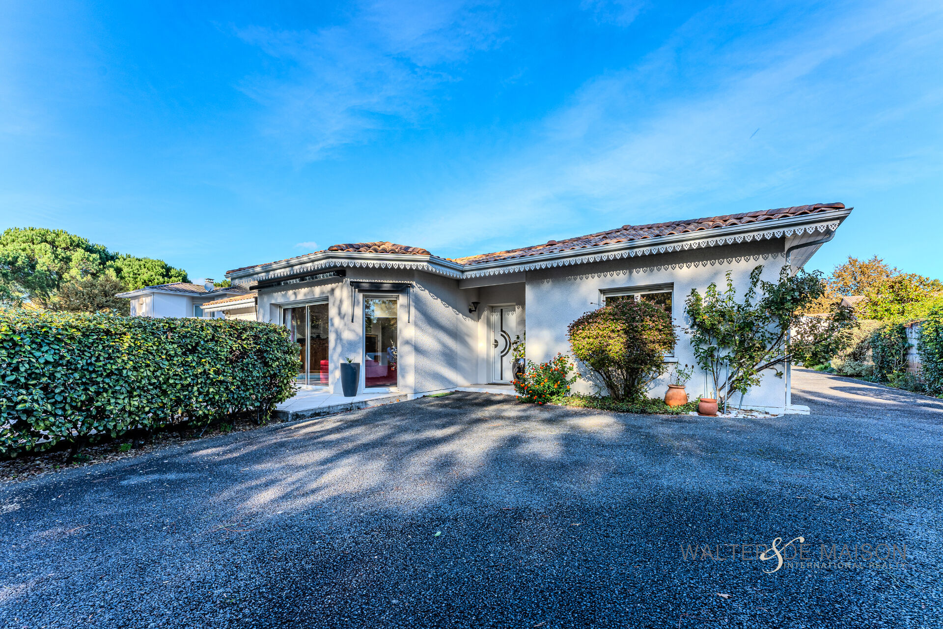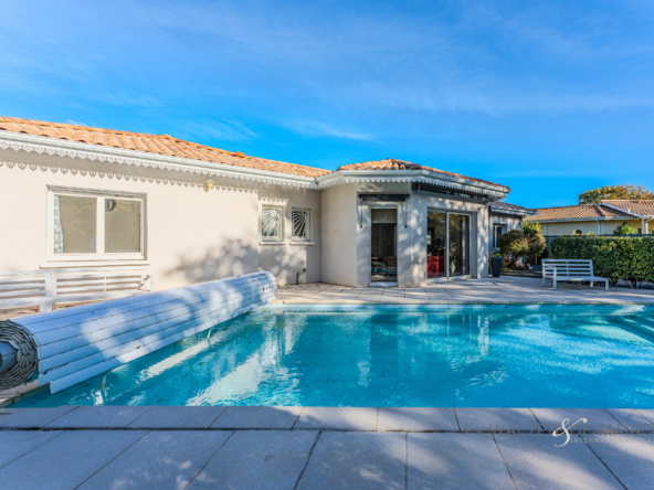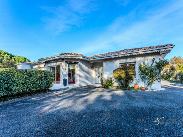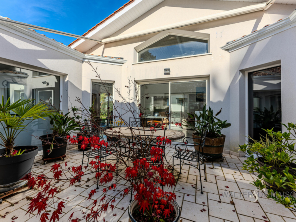 Exclusivité Lanton Immobilier by Walter et de Maison. Magnifique maison contemporaine de 177 m² de plain-pied construite idéalement située dans un quartier paisible et résidentiel. Érigée sur une belle parcelle de terrain paysager de 980 m², elle offre un cadre de vie privilégié, baigné de lumière et d’une organisation unique autour d’un patio central.