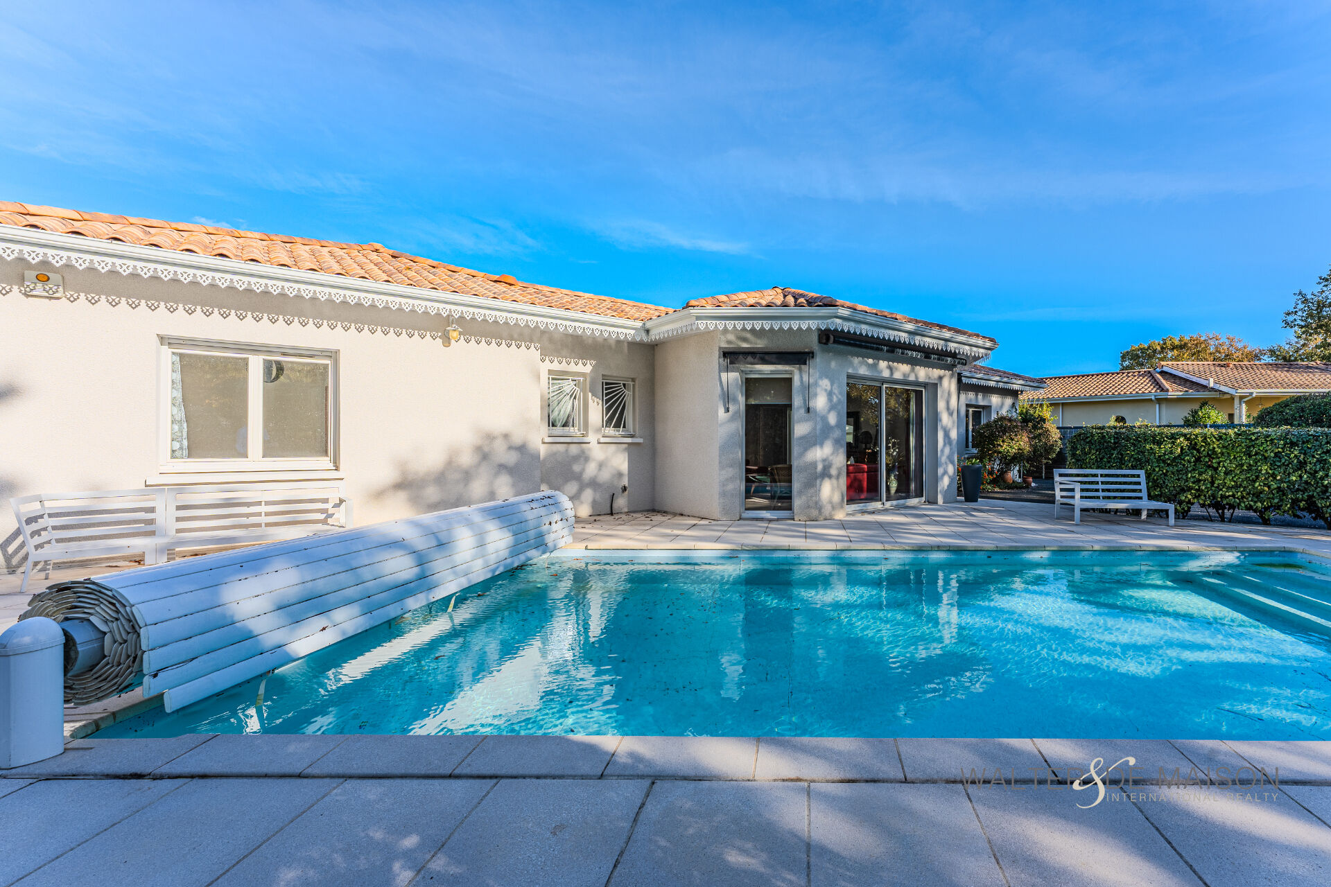 Piscine au sel (électrolyse) avec volet roulant sécurisé, nichée dans un écrin de verdure.
