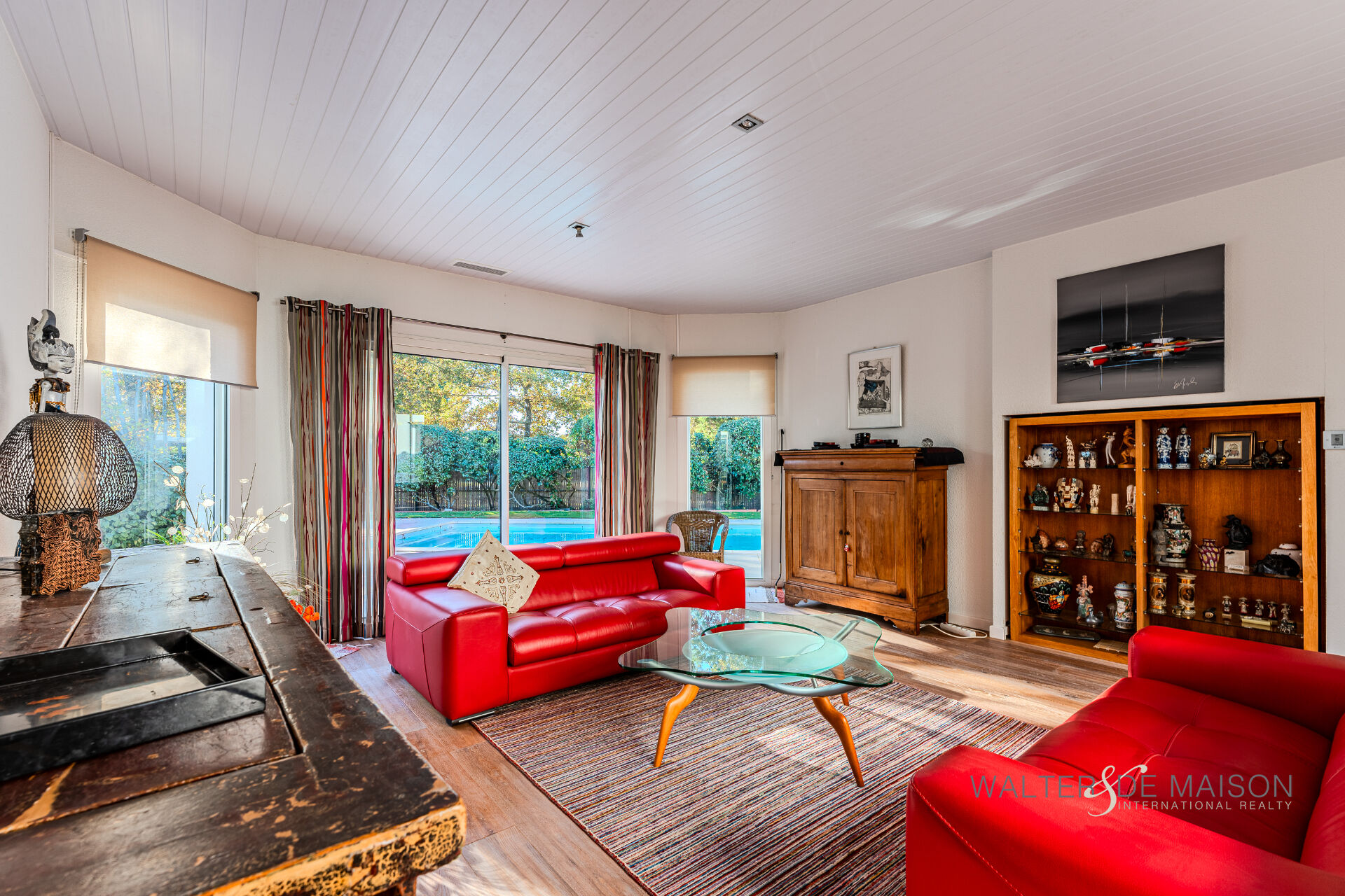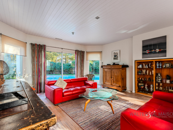 Salon Cosy : Profitez d’un second salon chaleureux de 28 m² avec vue et accès direct sur la piscine, parfait pour la détente.