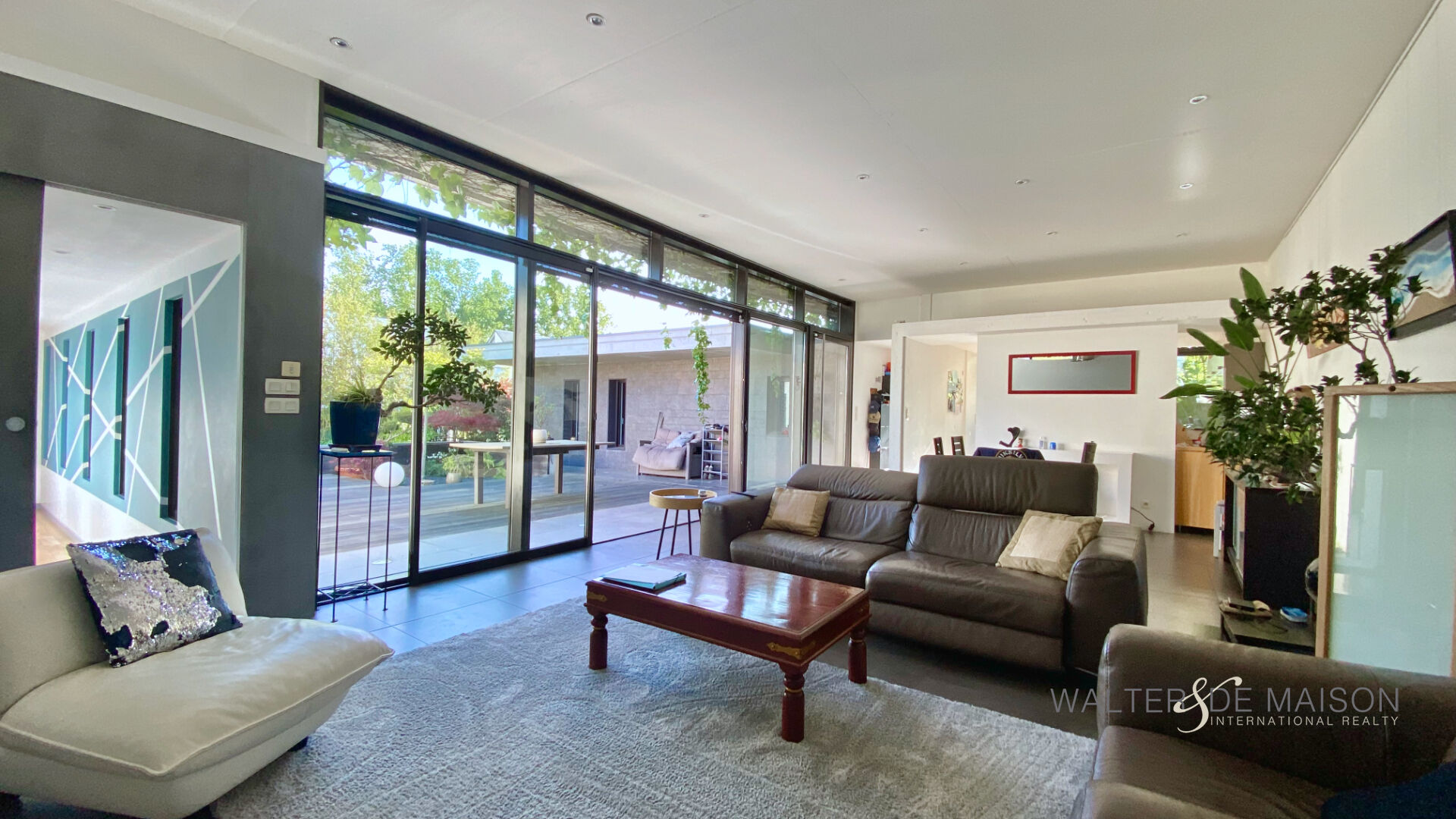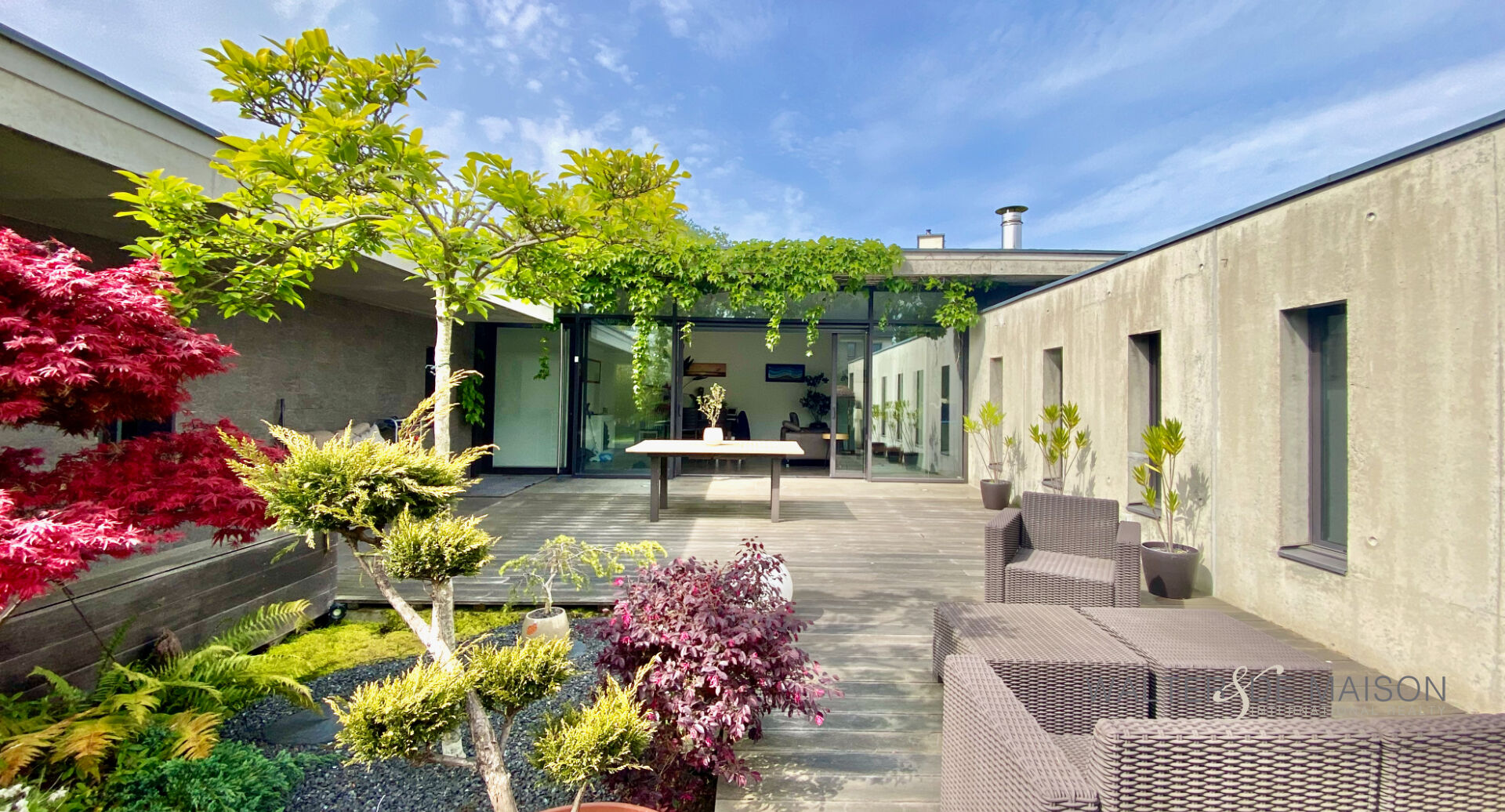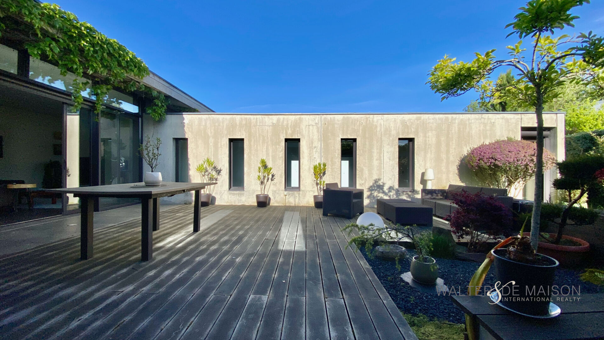 Un lieu de vie unique où l’architecture brute rencontre la douceur d’un jardin paysagé.